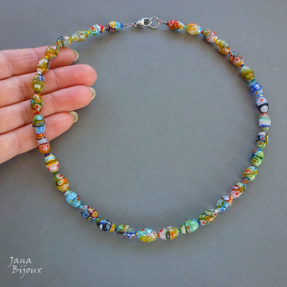 C1550 28/07/2021VENDIDOS ( Prodáno)Jana Bijoux Colar curto 47 cm de millefiori, feito em fio de aço encapado, com mini miçangas entre cada peça de millefiori , acabamento em inox. PEÇA ÚNICA R$ 65,00