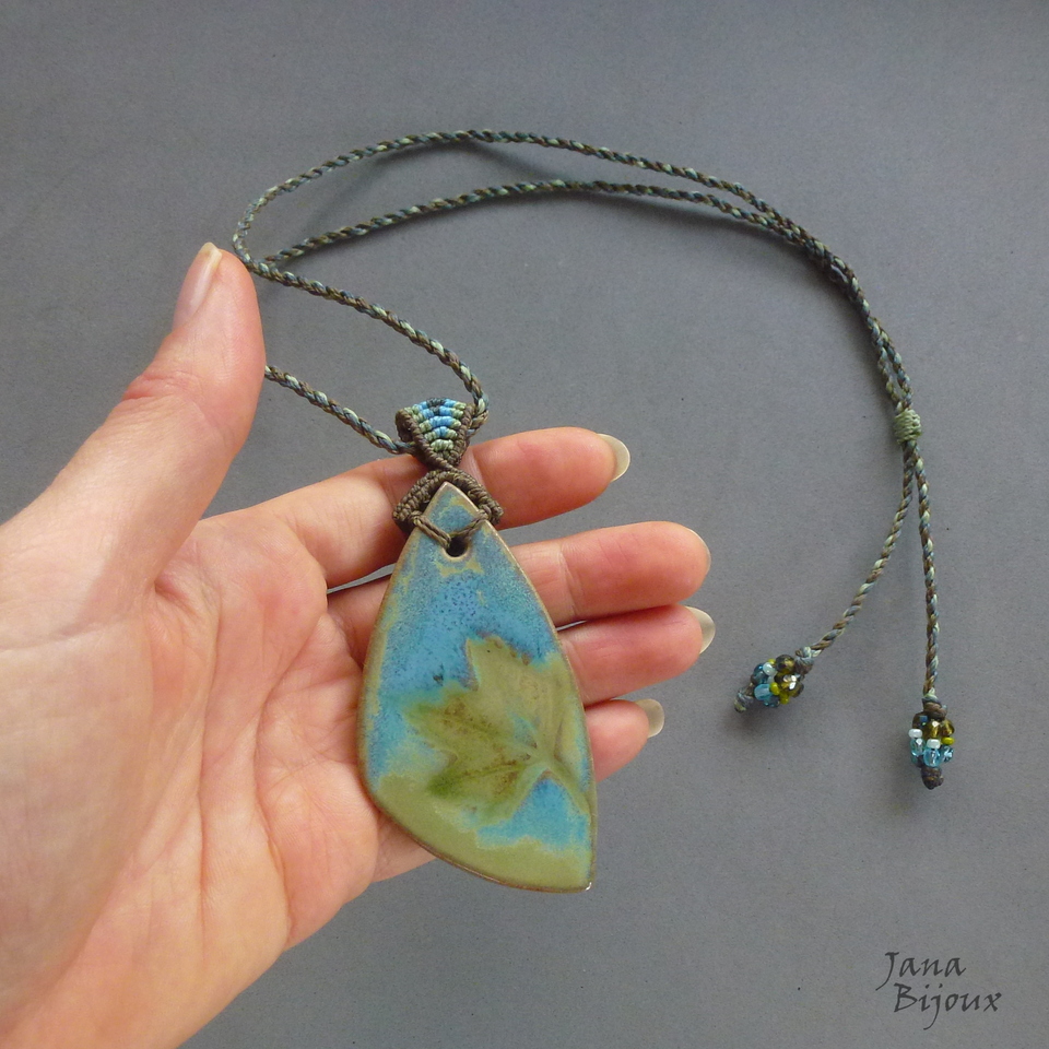 Cerâmica - mede 8 cm o pingente inteiro com a alça tem 9,6 cm e tem livre movimento no cordão. No avesso um trabalhado tmb que envolve a ponta da cerâmica.