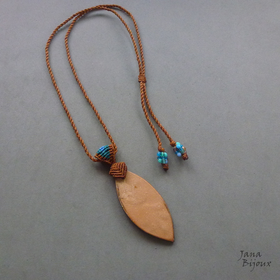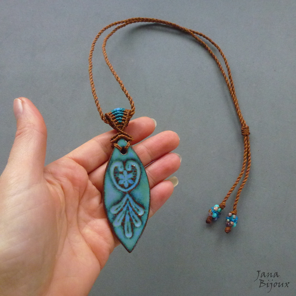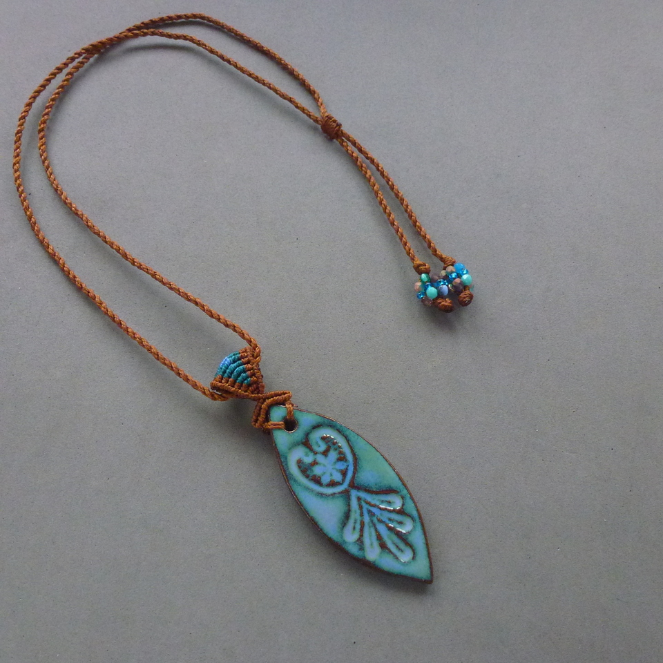 Cerâmica - esmaltação perfeita, linda de morrer, mede 7,5 cm o pingente inteiro com a alça tem 10 cm e tem livre movimento no cordão. No avesso um trabalhado tmb que envolve a ponta da cerâmica.
