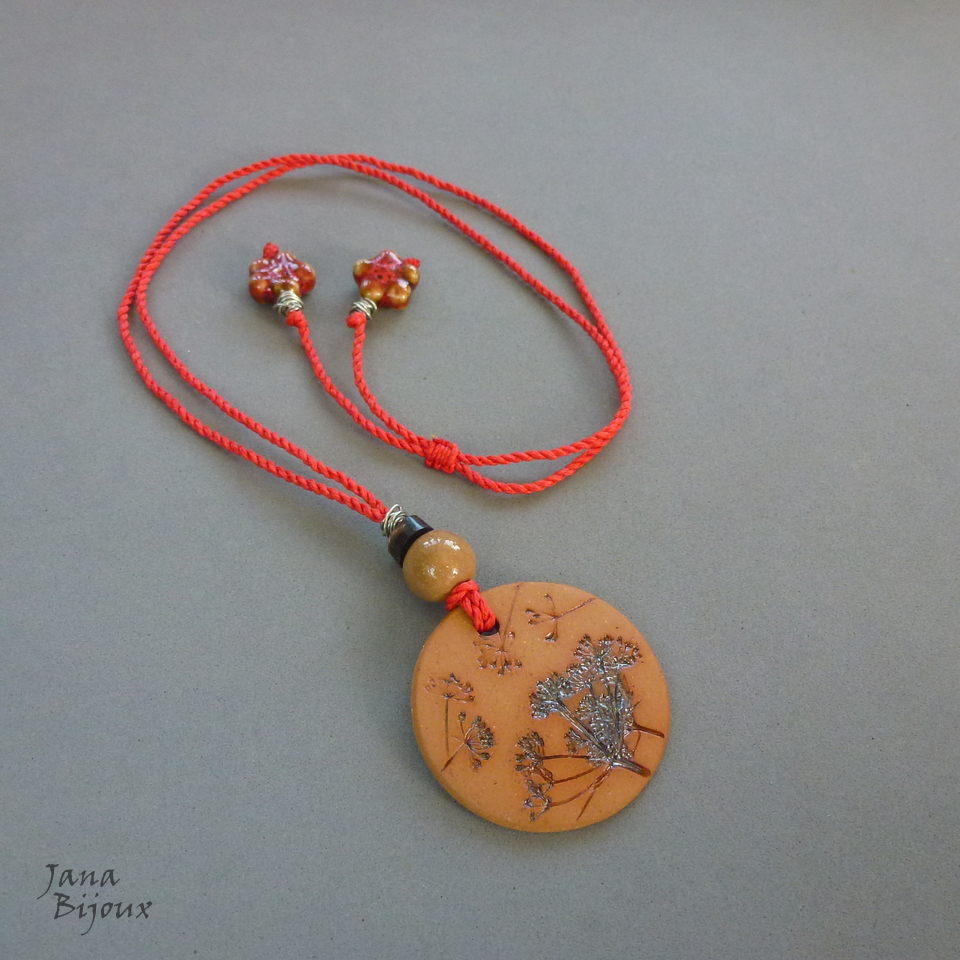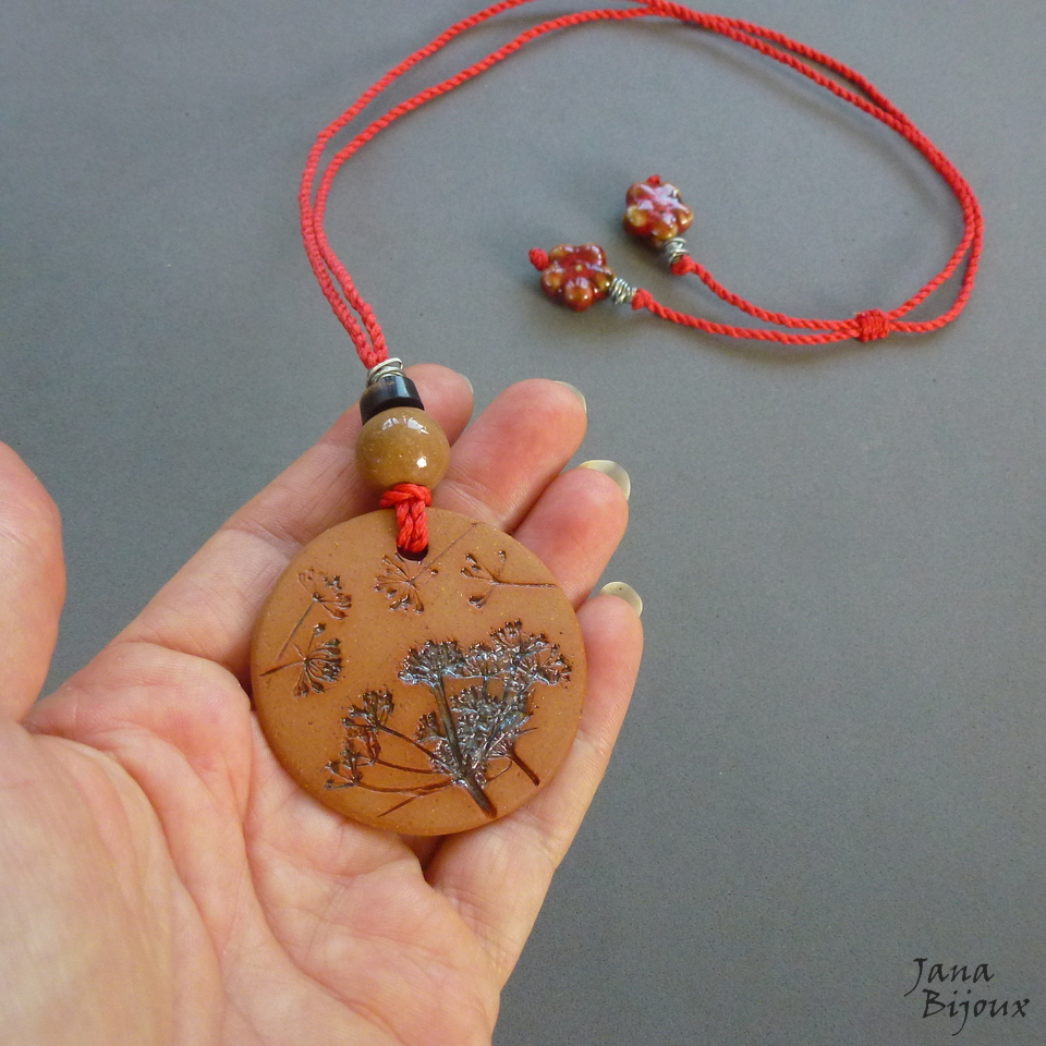 Nas pontas 2 flores de cerâmica esmaltada vermelha e arame de inox torcido, em cima da cerâmica uma bola de cerâmica, um disco de osso e arame de inox torcido a mão em formato de um ninho. Comprimento ajustável, tem 85 cm, pode ser usado curto, médio ou comprido.