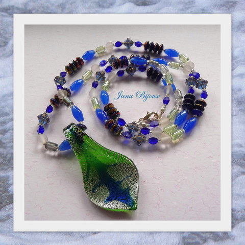 Colar comprido de vidro e pingente é vidro feito a mão.