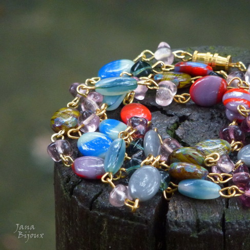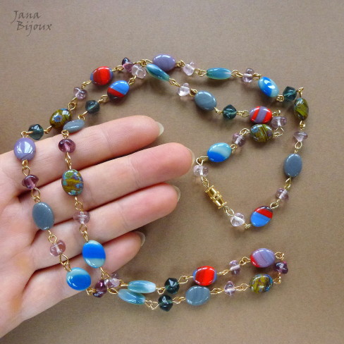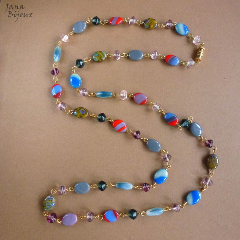 Colar comprido 85 cm com componentes dourados e vidro colorido R$ 38,00. PEÇA ÚNICA