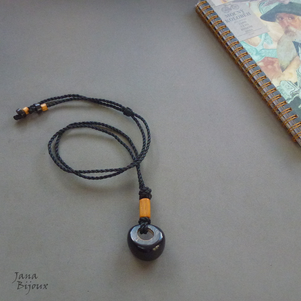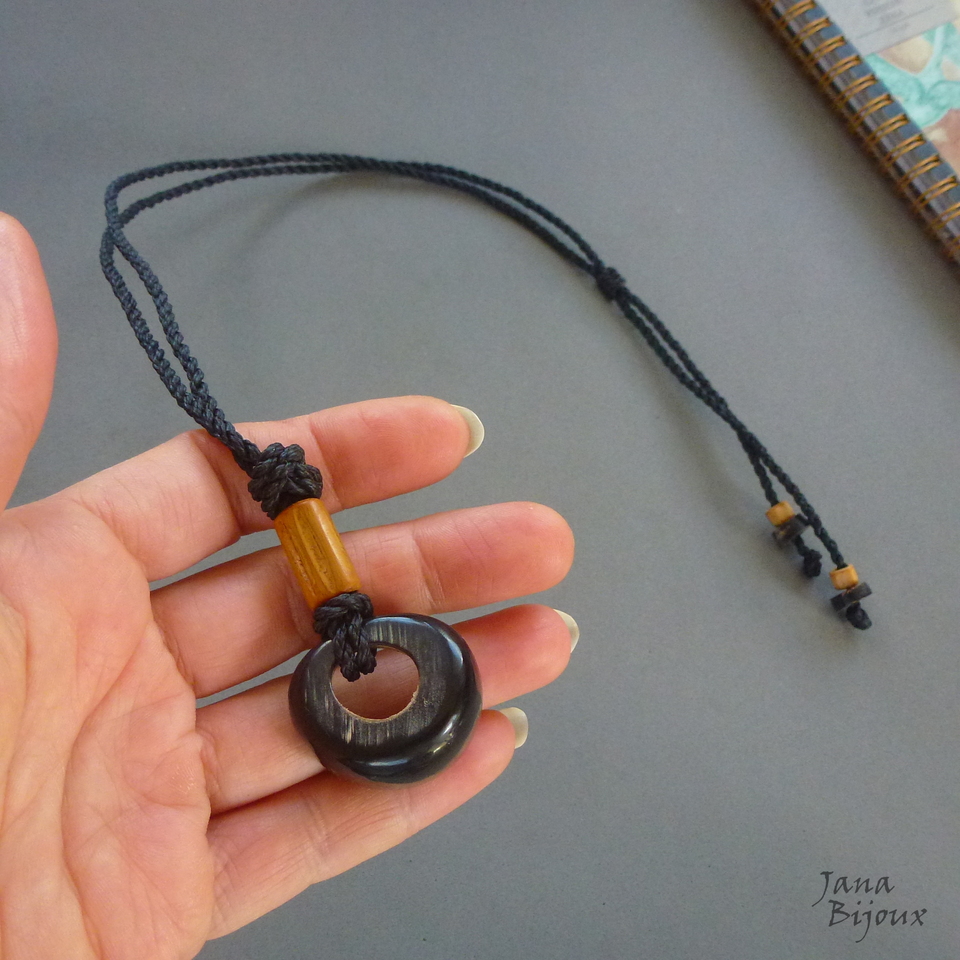ch103 02/08/2021VENDIDOS ( Prodáno)Jana Bijoux Unissex, colar com laterais mais grossas, cor preta com peças de chifre e bambu. Comprimento ajustável, pode ser usado como curto, médio ou comprido, abre até 80 cm. R$ 28,00