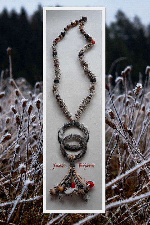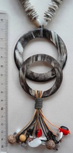 VELMI PRACNÝ, DLOUHÝ NÁHRDELNÍK S DVĚMA SLEPENÝMI KRUHY Z ROHOVINY, ZLOMKY MUŠLÍ, SEMÍNKY, PERLETÍ A KERAMICKÝM ZAKONČENÍM 422,00 Kč.