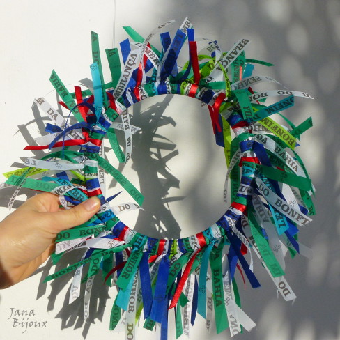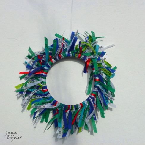 Guirlanda 22/11/2013VENDIDOS ( Prodáno)guirlanda de fitas, guirlanda natalinaJana Bijoux Guirlanda Natalina pouco convencional – para porta ou outro lugar qualquer, 19 cm de argola, de ponta a ponta das fitas 39 cm, 99 fitas R$ 35,00 PEÇA ÚNICA