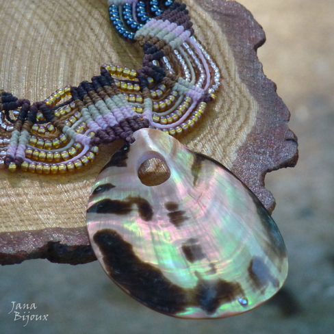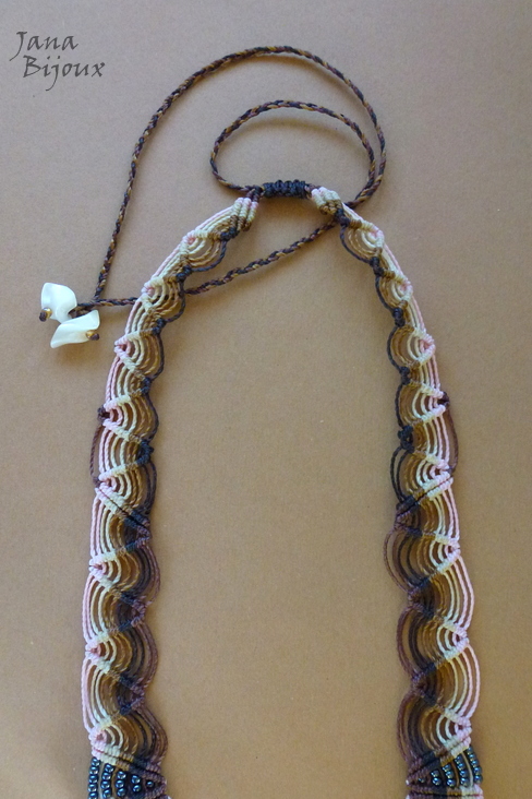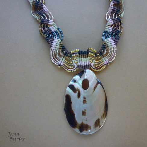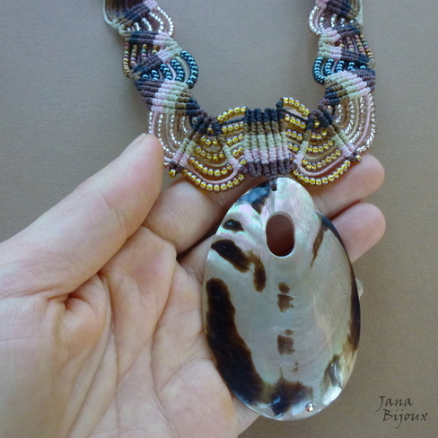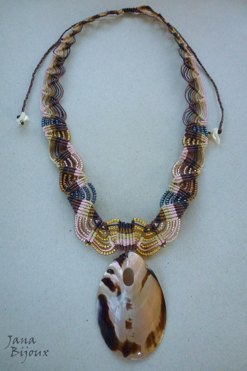 Colar de comprimento médio ou comprido, todo feito de macramé, sem metal nenhum, com miçangas metálicas de diversas cores (onyx, dourada, rosa, levemente acobreadas), caimento perfeito no pescoço, durabilidade para sempre. Cada ponta de colar tem um cascalho grande de madrepérola com uma miçanga dourada para dar um brilho.