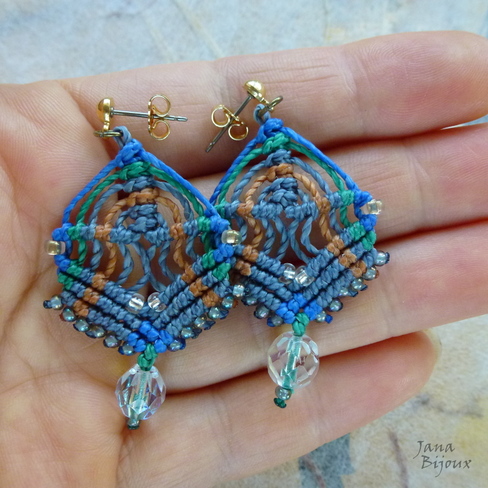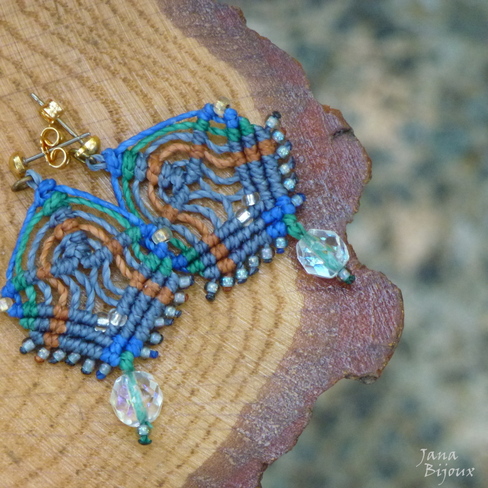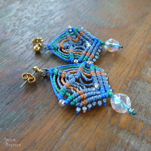 Brincos médios de micromacramé, com mini miçangas e cristal furta-cor que refletirá luz e trará brilho para o rosto (e que por motivo desconhecio não da para ver muito bem na foto :-)). Comprimento 5,2 cm, fecho com tarraxa de titânio, acabamento dourado R$ 15,00.