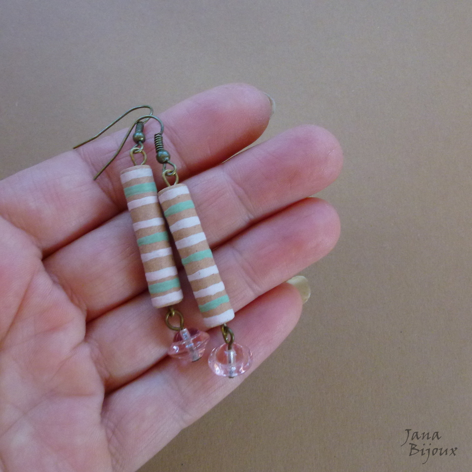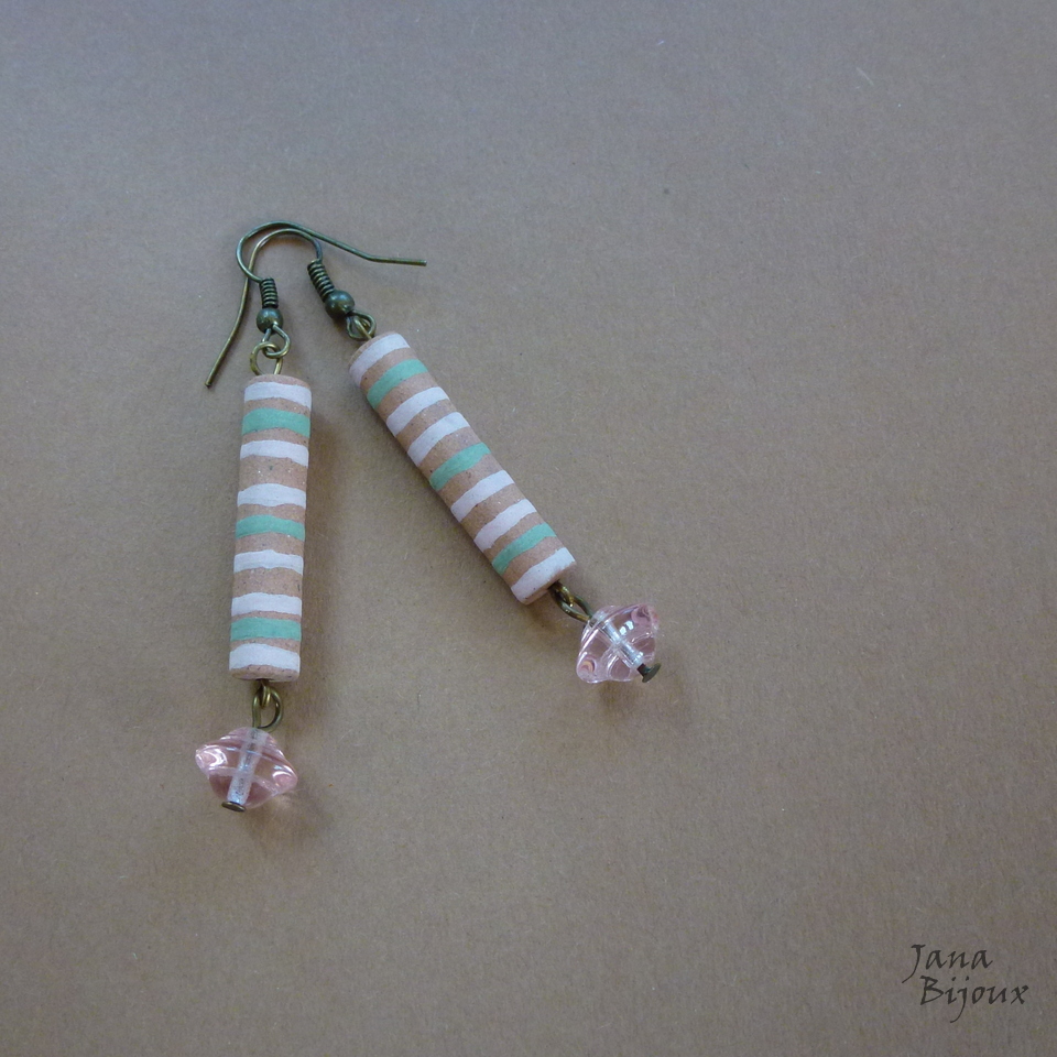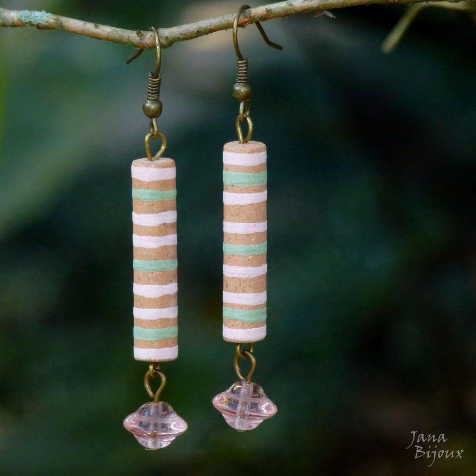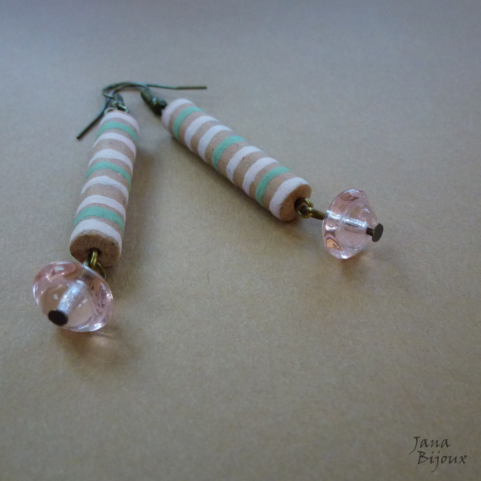 Brincos compridos 6,6 cm de cerâmica, desenhados a mão como toda cerâmica que uso, pela grande Janete Dallabona e com vidros transparentes rosa claro. Leves e com componentes sem niquel. R$ 18,00