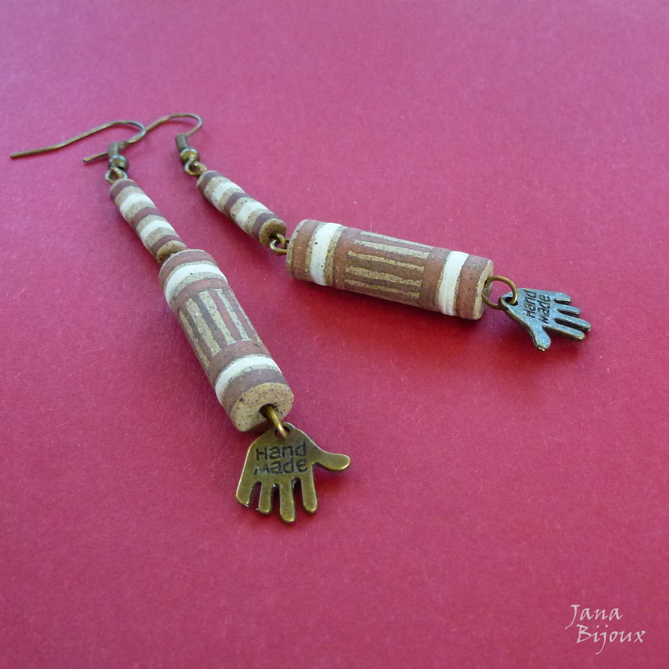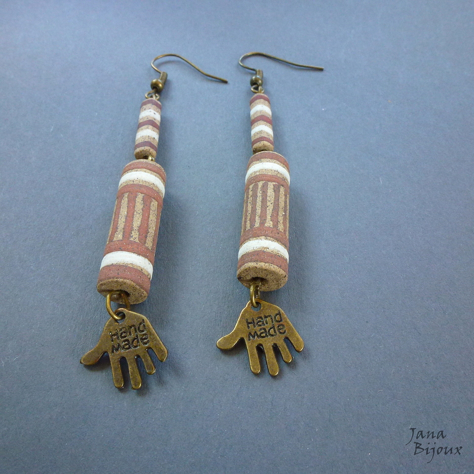 Brincos compridos 8,5 cm de cerâmica, desenhados a mão como toda cerâmica que uso, pela grande Janete Dallabona e com pingente de mãozinhas com escrita HAND MADE. Leves e com componentes sem niquel. De R$ 28,00 para R$ 24,00