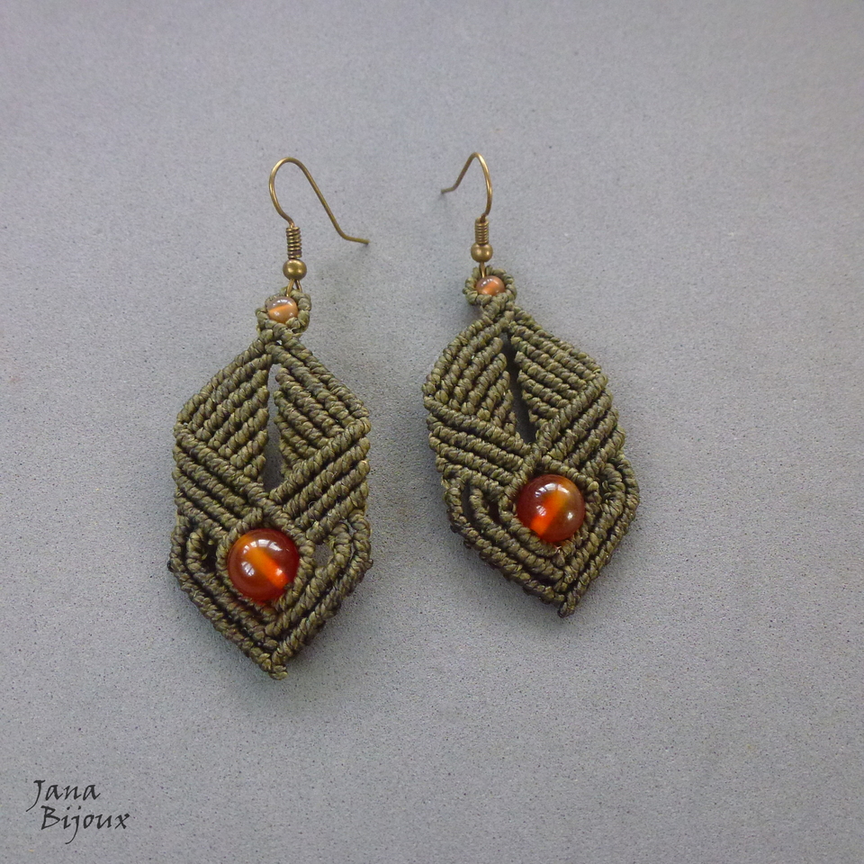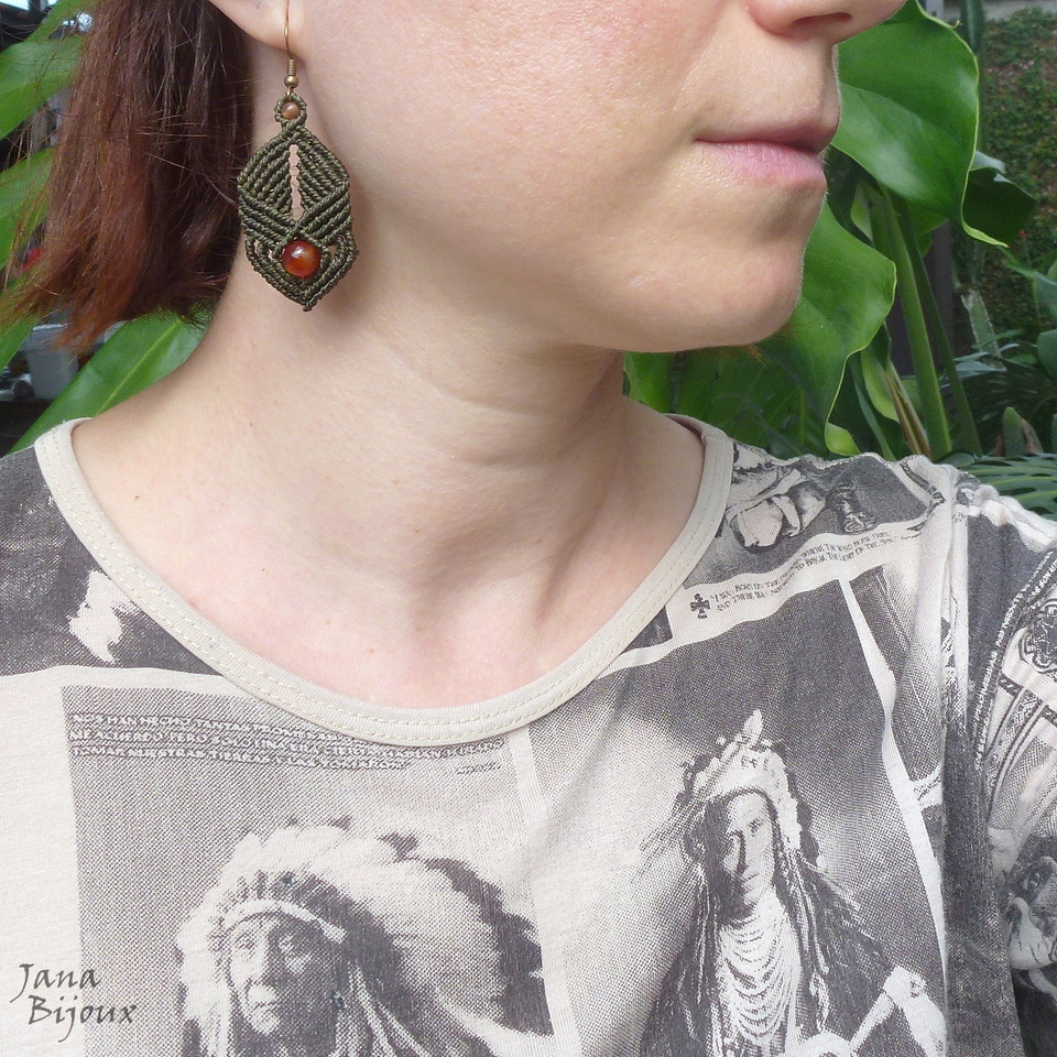 Brincos de cor verde militar, com pedras cornalina , anzol sem niquel, comprimento 6,5 cm  R$ 34,00