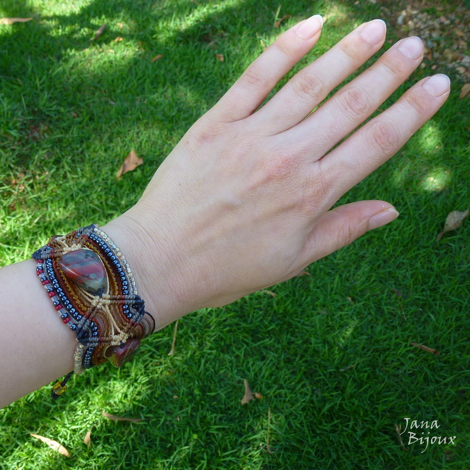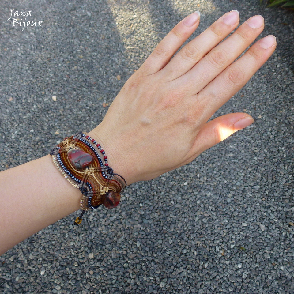 Pulseira tons quentes de marrons, palha e grafite..  coringa.. de macramé, comprimento ajustável, miçangas coloridas ( (nas laterais distribuidas em zig zag) e 3 pedras de ferro de tigre,  sem metal.