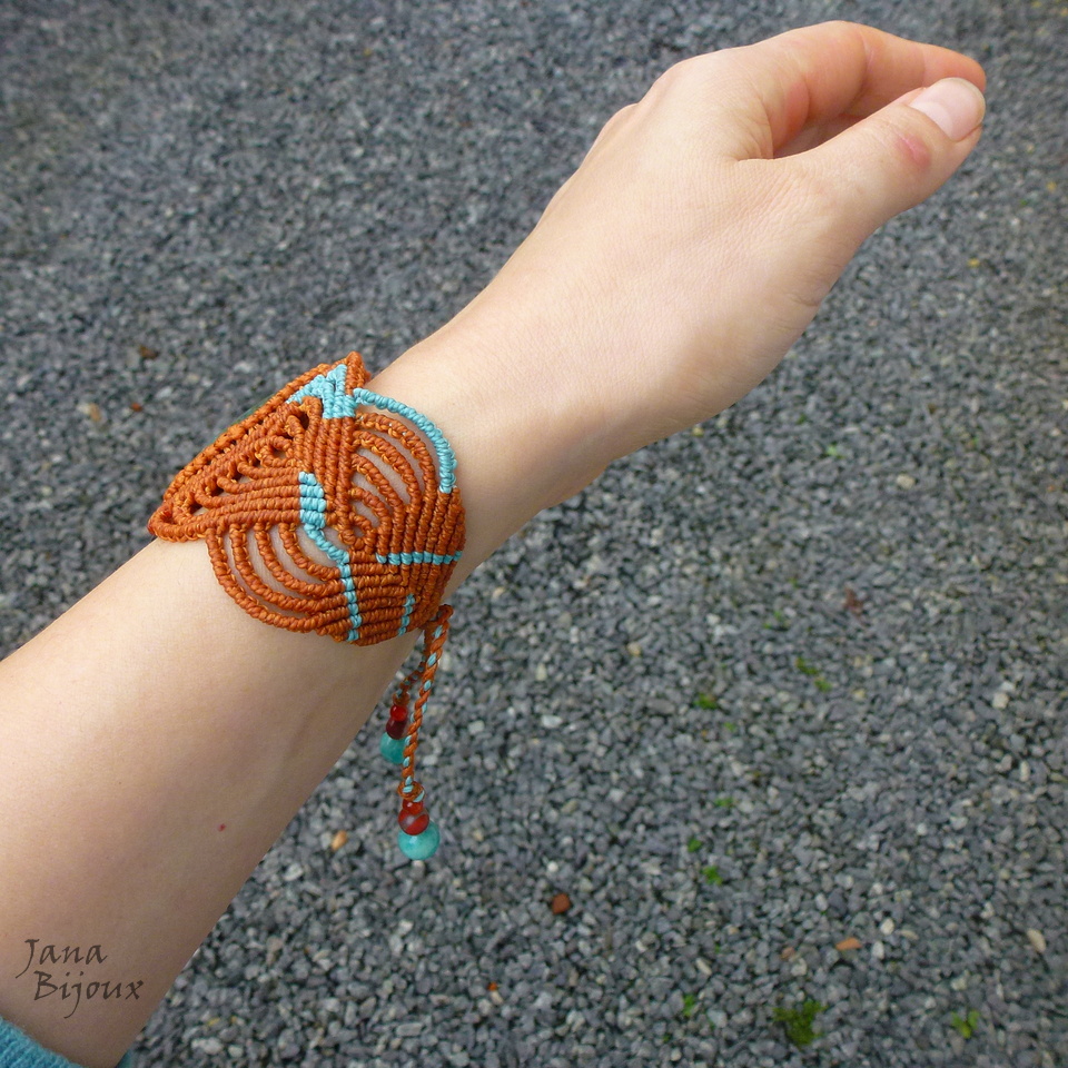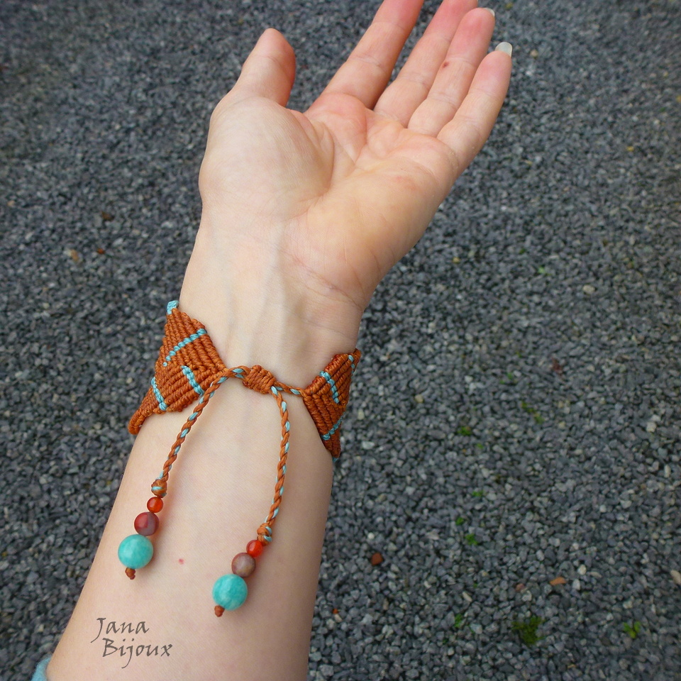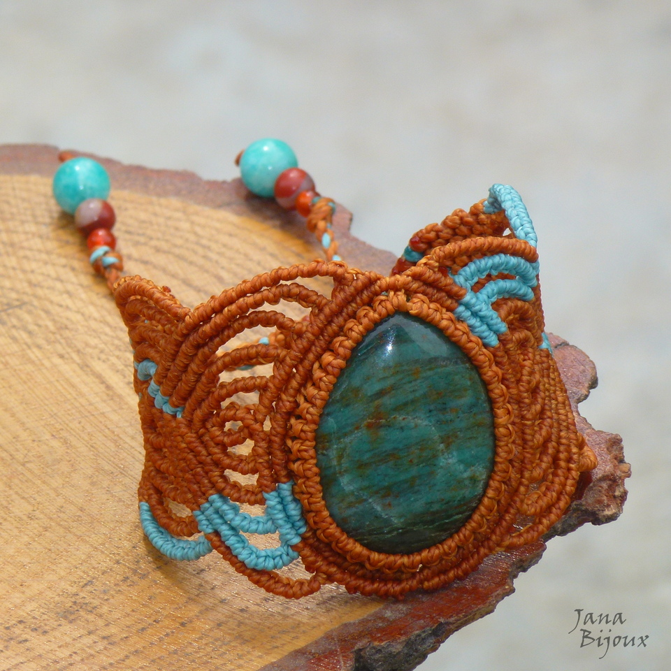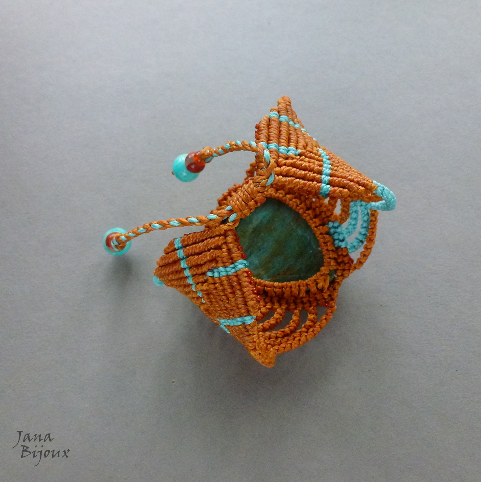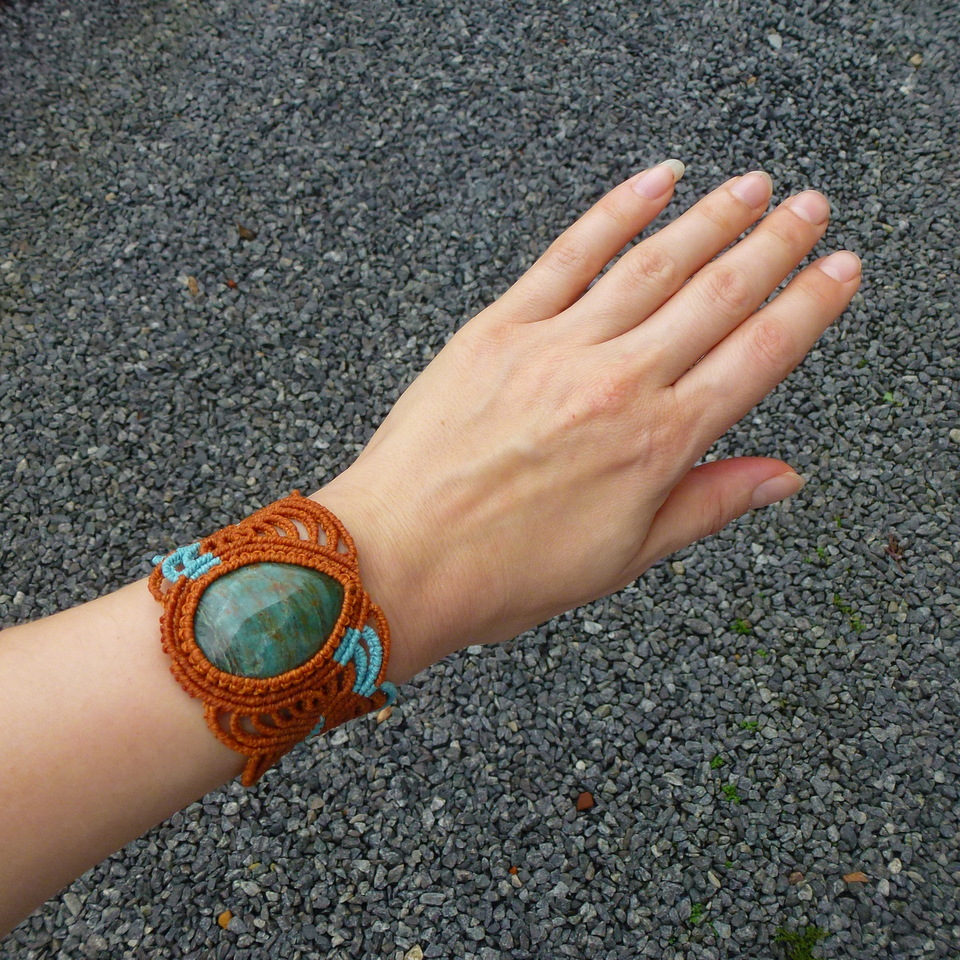 A pedra – mede 4 x 3 cm.  Com macramé a altura do centro da pulseira é 4,7 cm.  É lapidada em formato gota e como cabochon (= pedra preciosa polida sem arestas, em formato circular)