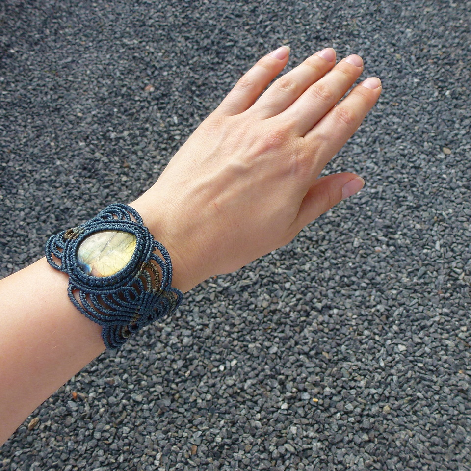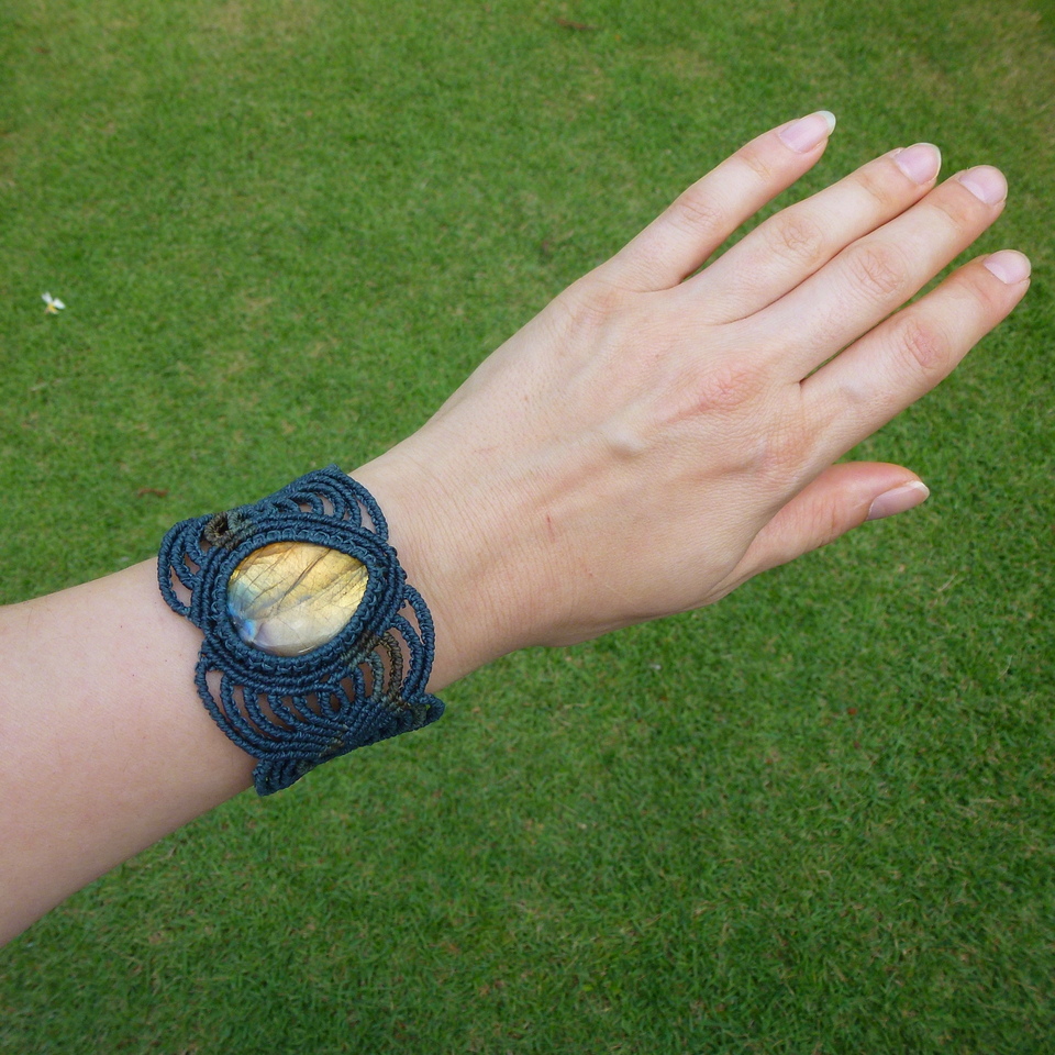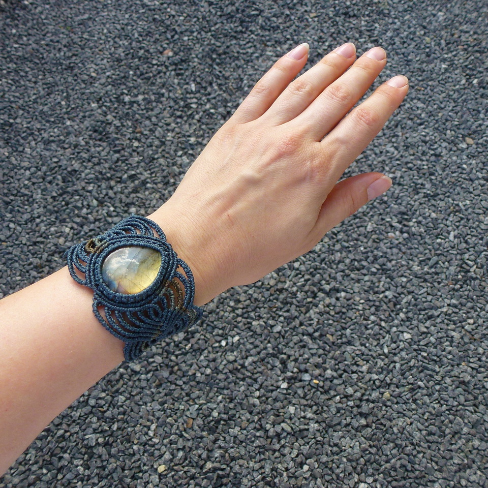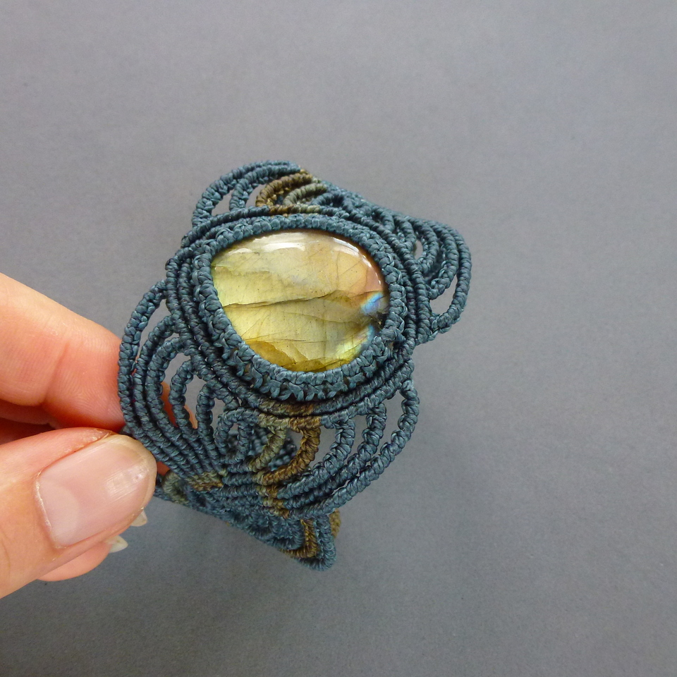Bracelete de labradorita, largura 5 cm, comprimento ajustável, pedra de Madagascar, com linda luz, labradorização, cor de fio azul acinzentado, verde militar e marrom militar. R$ 120,00