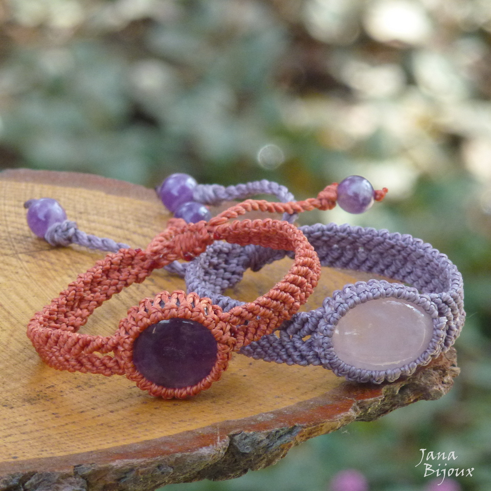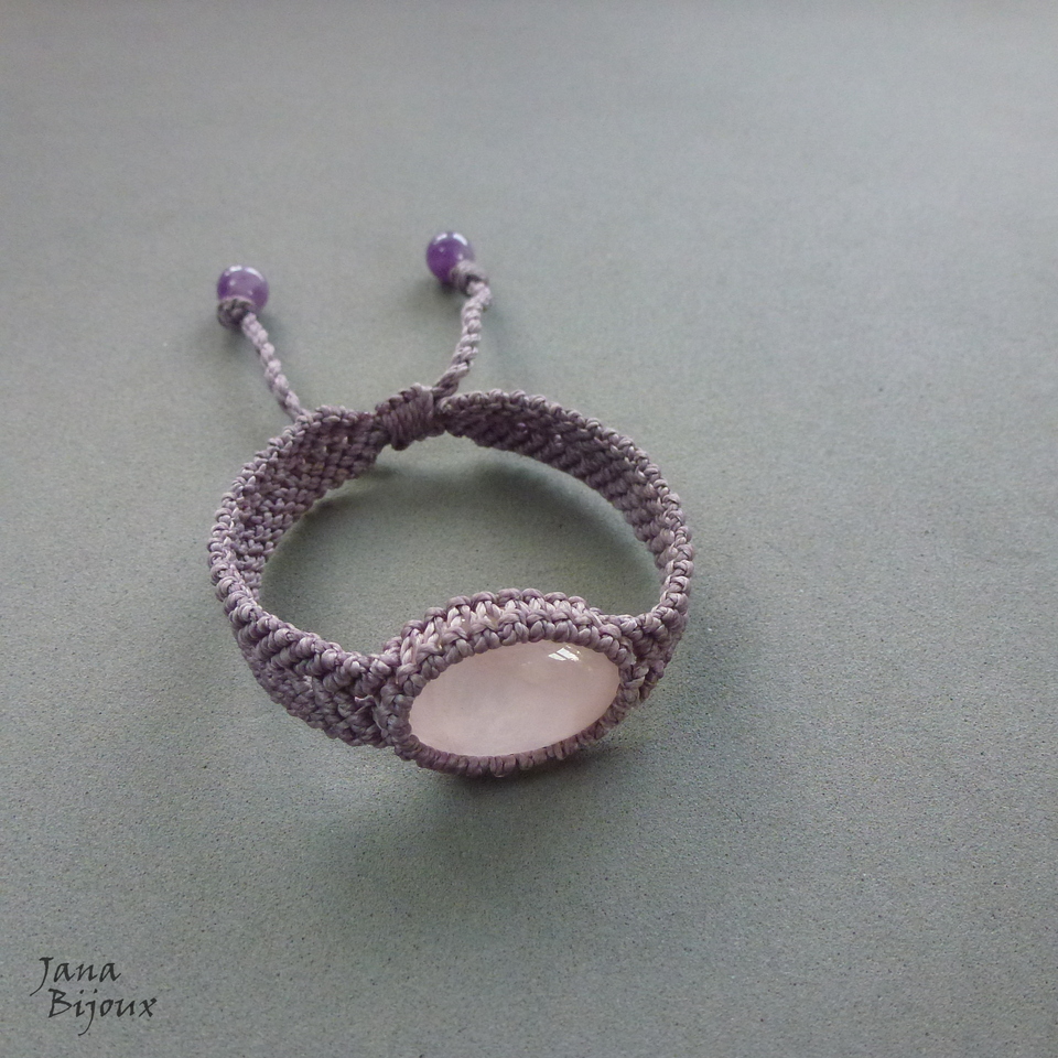 Pulseira de macramé com fio lilás e quartzo rosa, mínimo comprimento 16 cm, max. 23,5 cm.