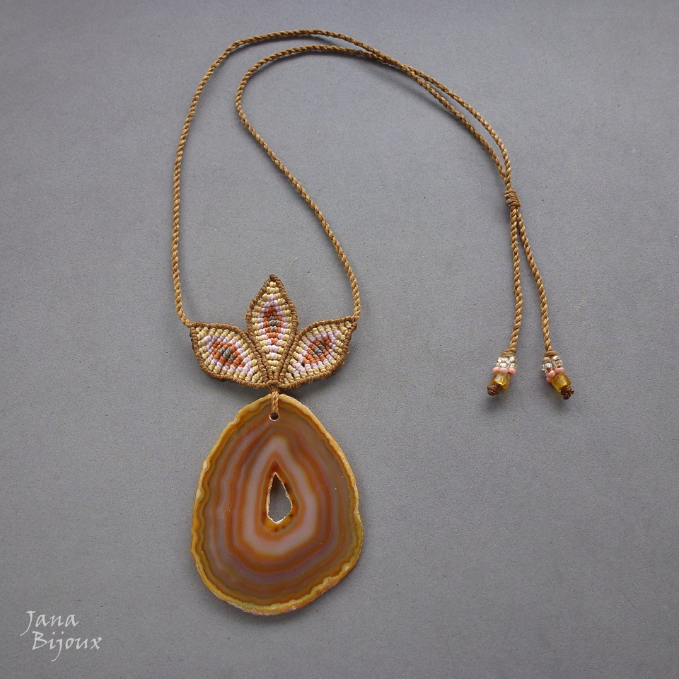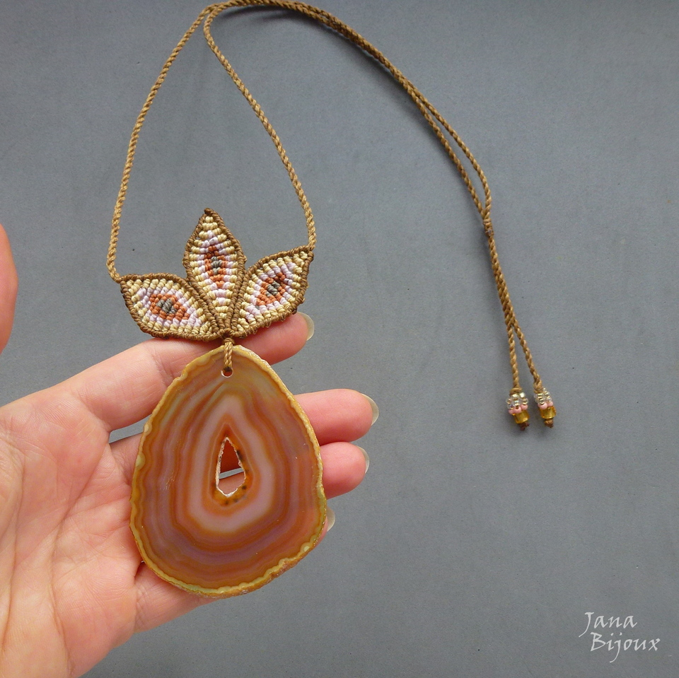 Pedra - ágata brasileira, mede 6,8 cm por 5,1 cm, o pingente inteiro com as folhas tem 11 cm.