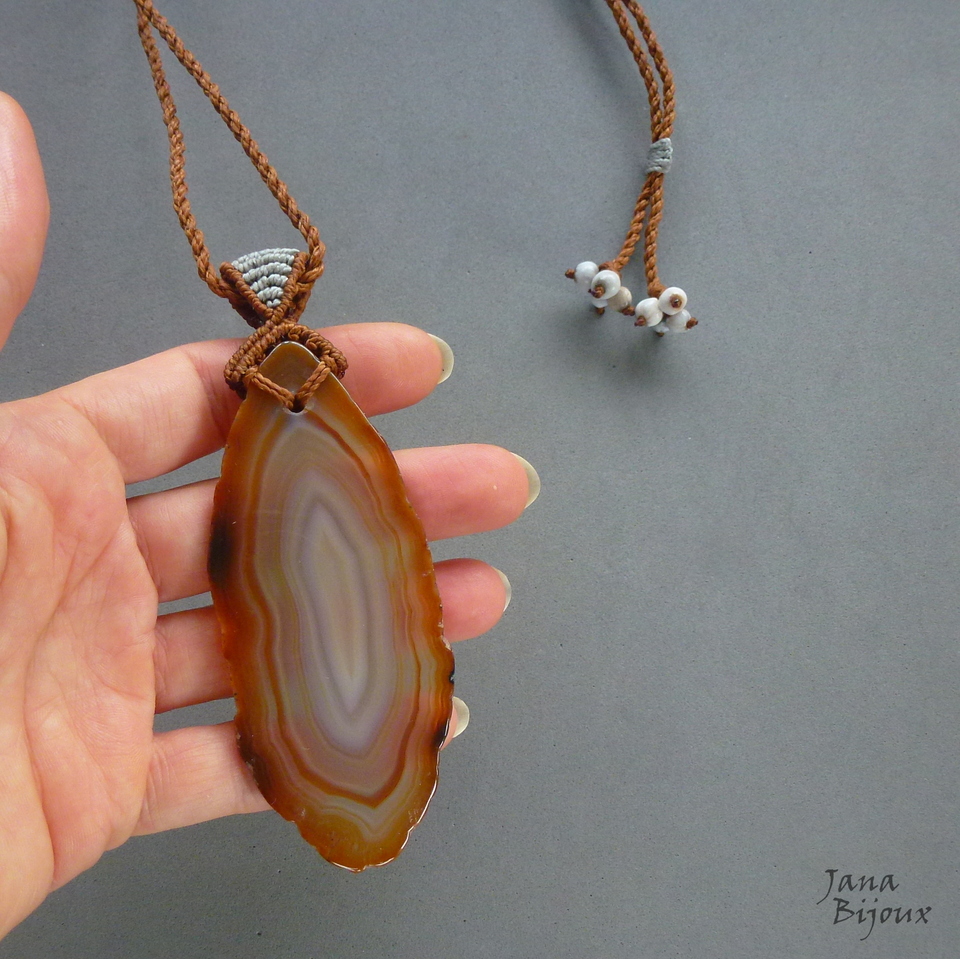 Cor de fio: caramelo ferrugem e cinza na alça. (fiz outros colares com pedras, outras cores, mesmo estilo de macramé como vc pode ver nas fotos adicionais. cada uma delas tem seu códico e  preço. )