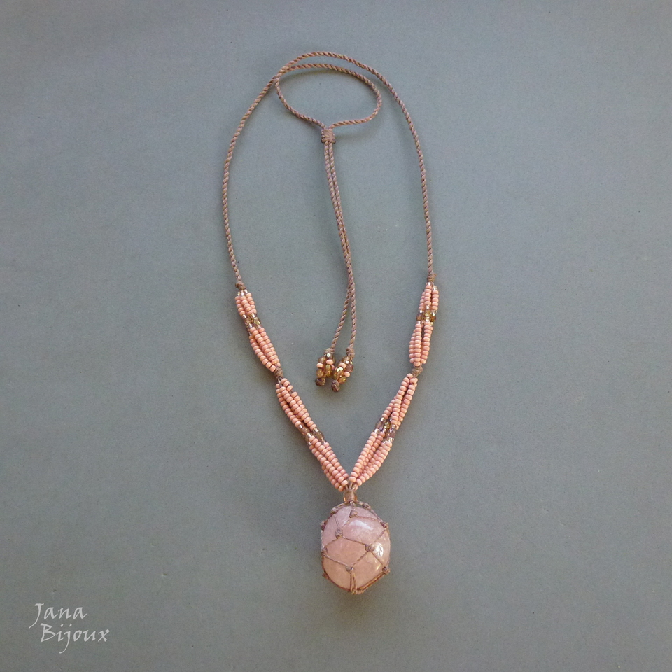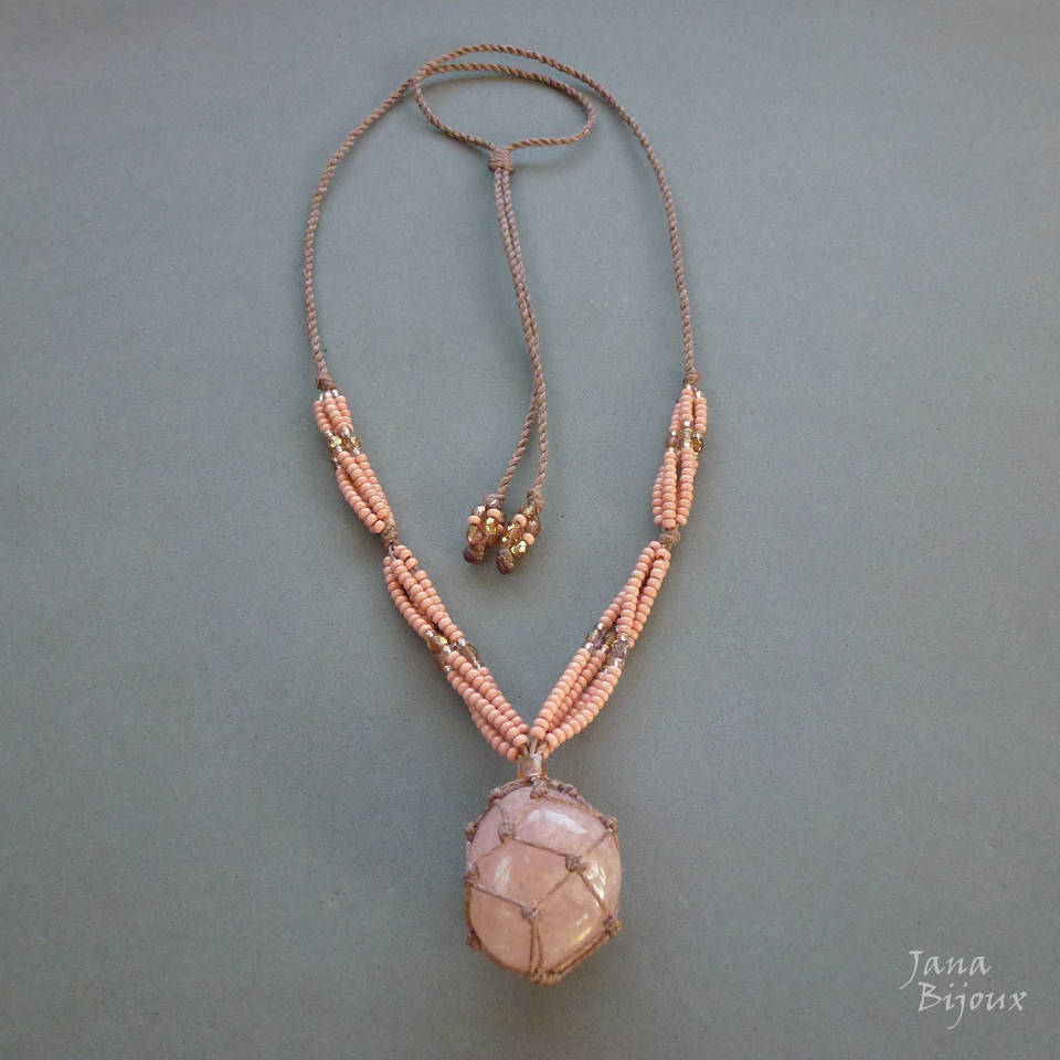 Quartzo rosa, castroado, miçangas e comprimento ajustável.