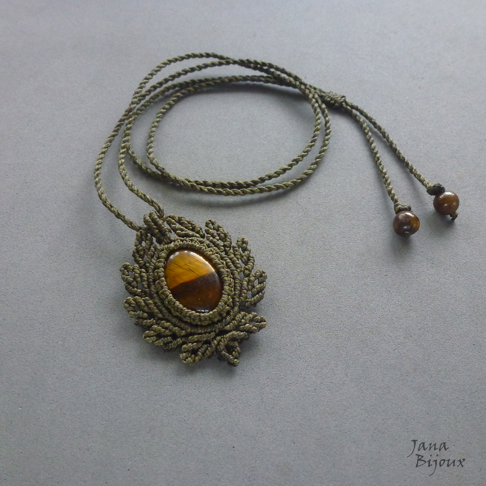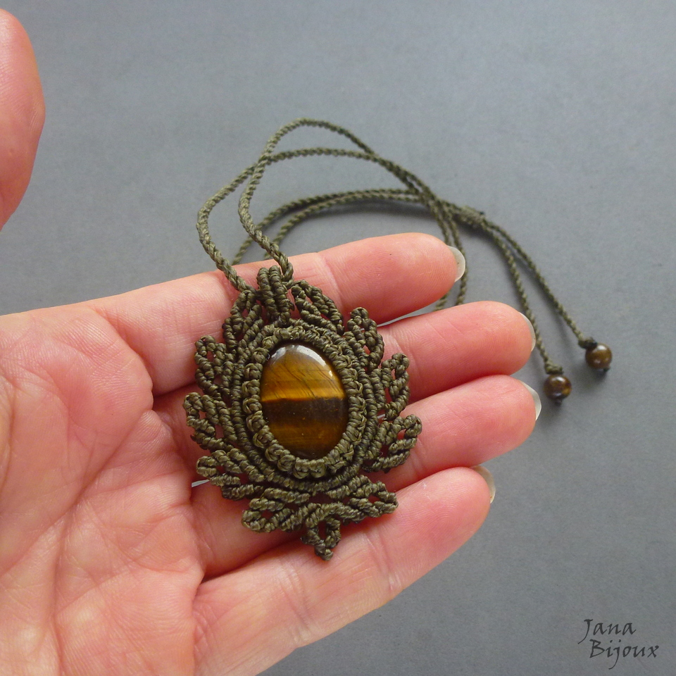 Pedra - tem polimento cabochão (= pedra preciosa polida sem arestas, em formato circular. Plana de uma lado e arredondada de outro). Mede 2,7 cm por 2,2 cm, o pingente inteiro com a alça e macrame tem 5,5 cm por 4 cm .