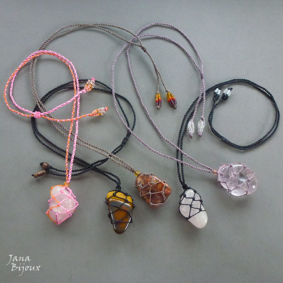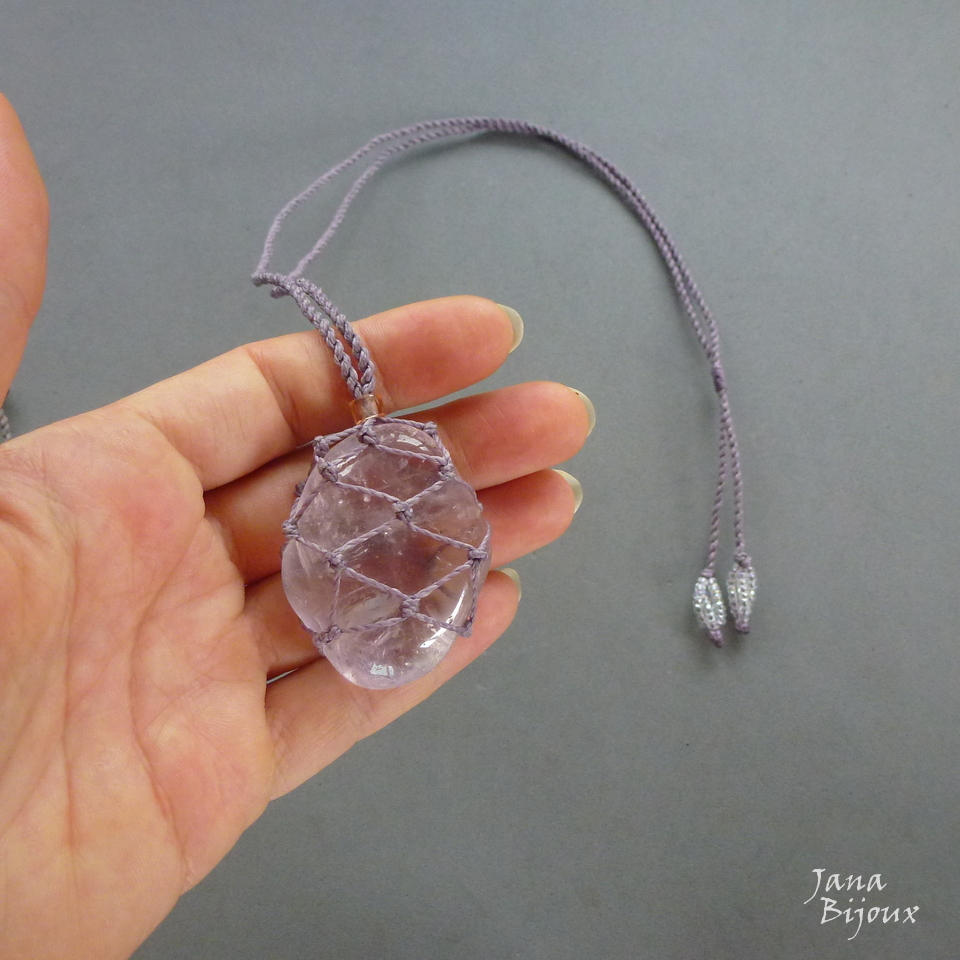 Pedra mede 5 cm por 3,7 cm e segura só com nós. Em cima dela uma peça de vidro cor rosa claro, importada, para dar extra acabamento sofisticado.