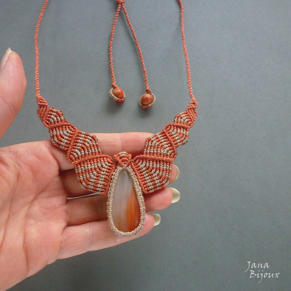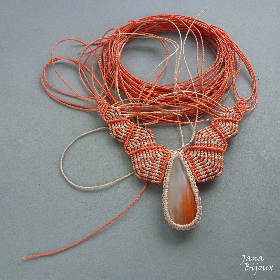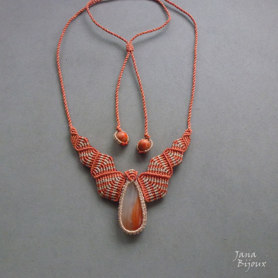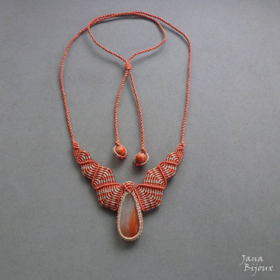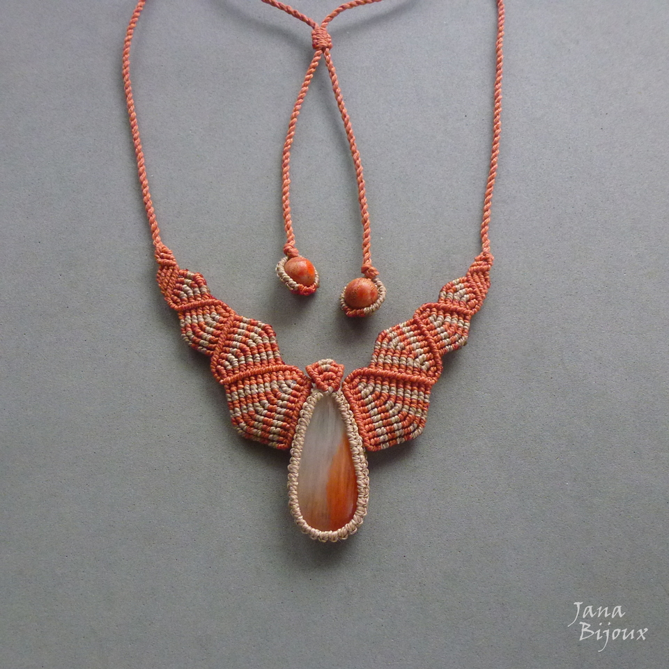 Colar delicado e no mesmo tempo elaborado de macramé e pedra quartzo laranja.