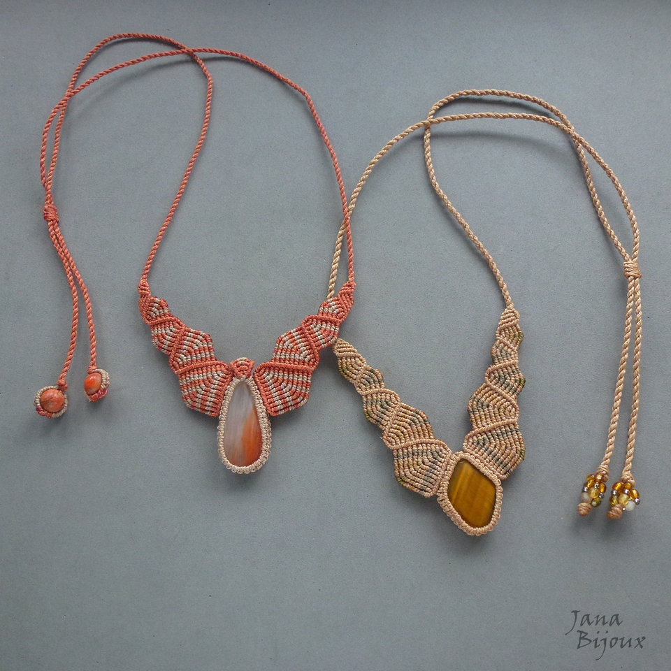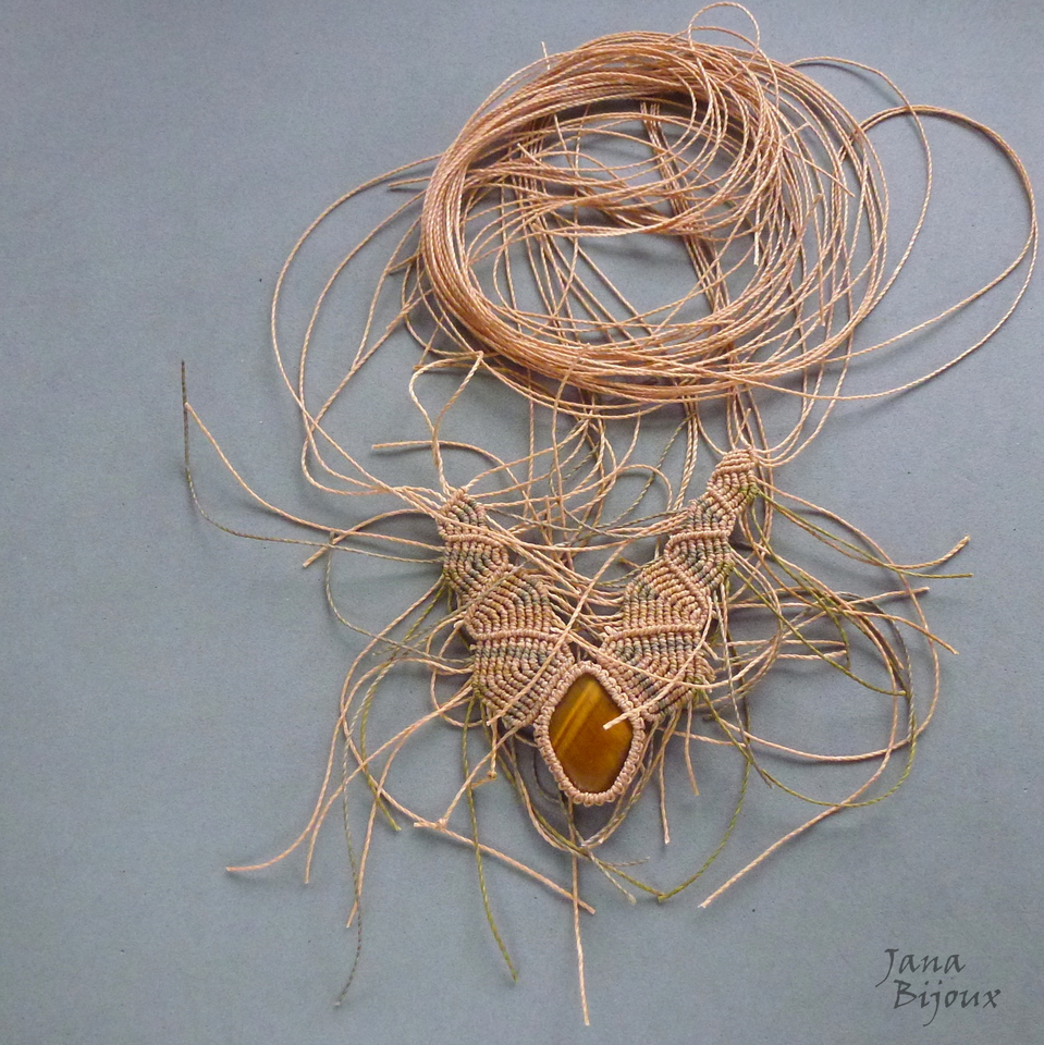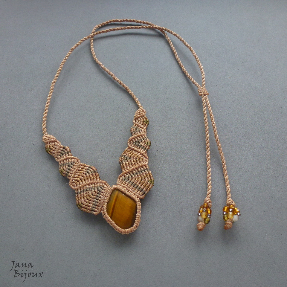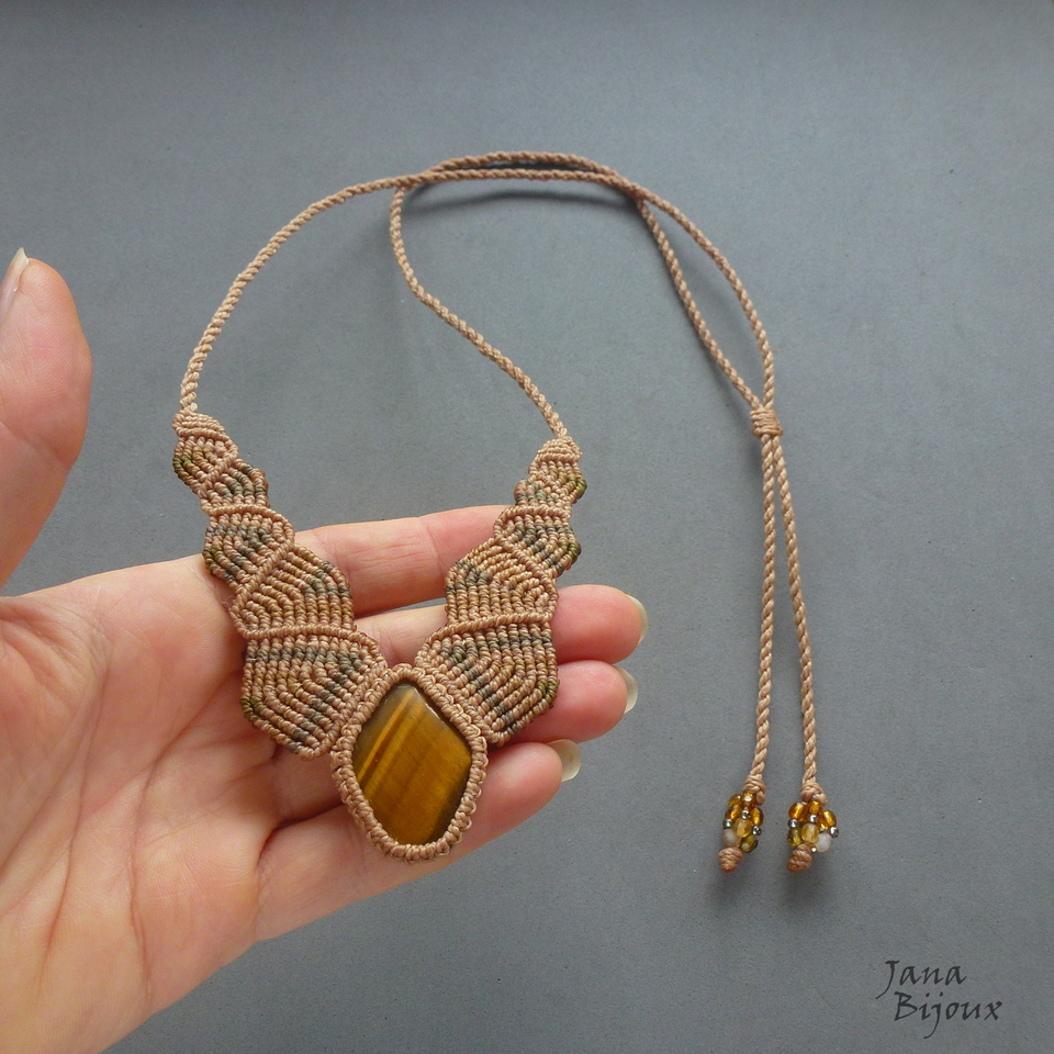 Colar mais delicado, neutro, discreto, com olho-de-tigre, feito de macramé, totalmente sem metal.