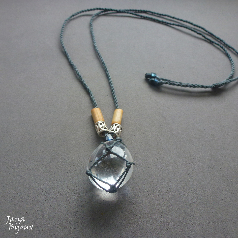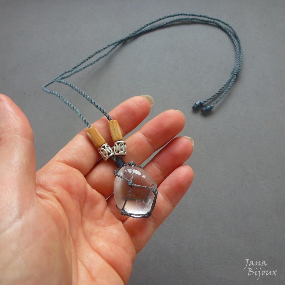Pedra mede 3,5 cm por 2,5 cm e segura só com nós. Em cima dela uma peça de vidro cor azul discreto, importada, para dar ao acabamento maior sofisticação. Prata e bambu tem livre movimento no colar.