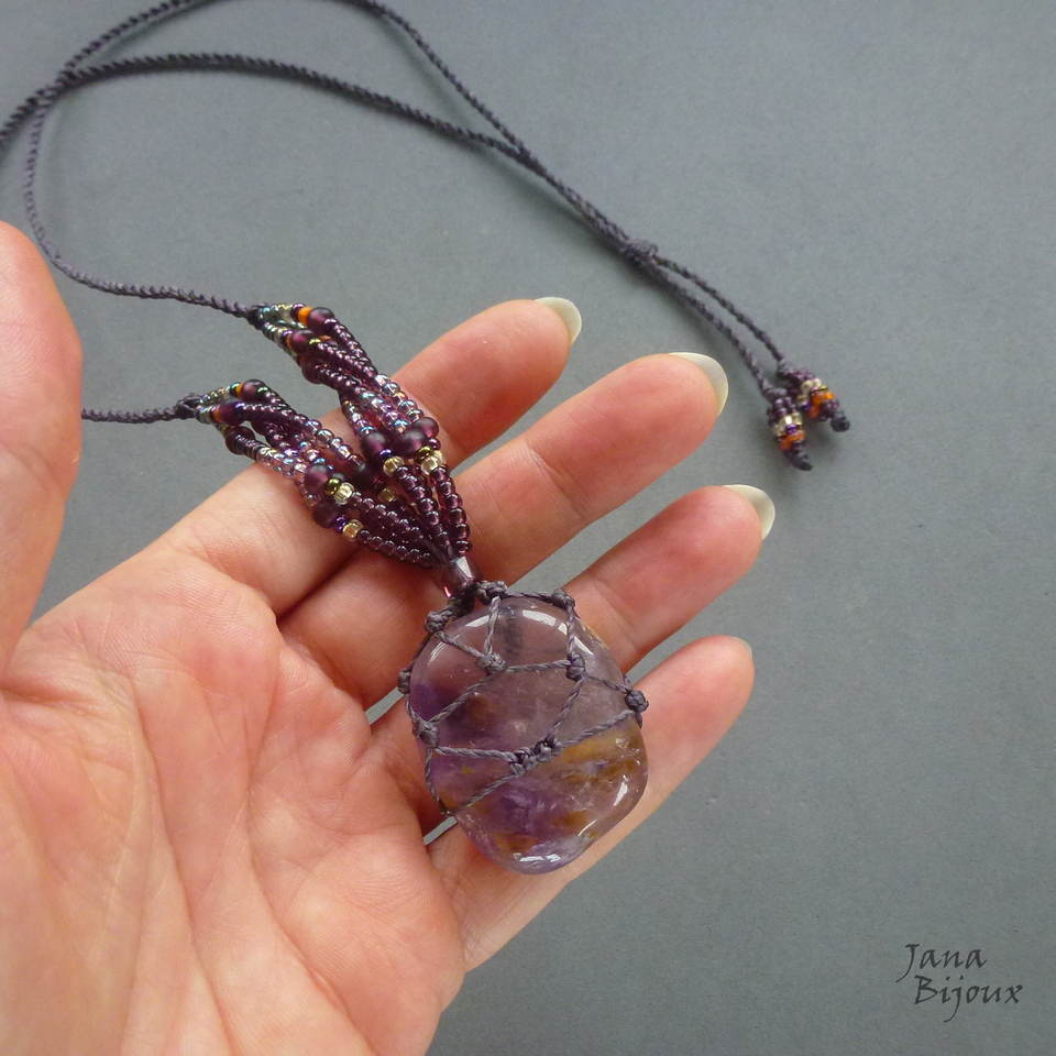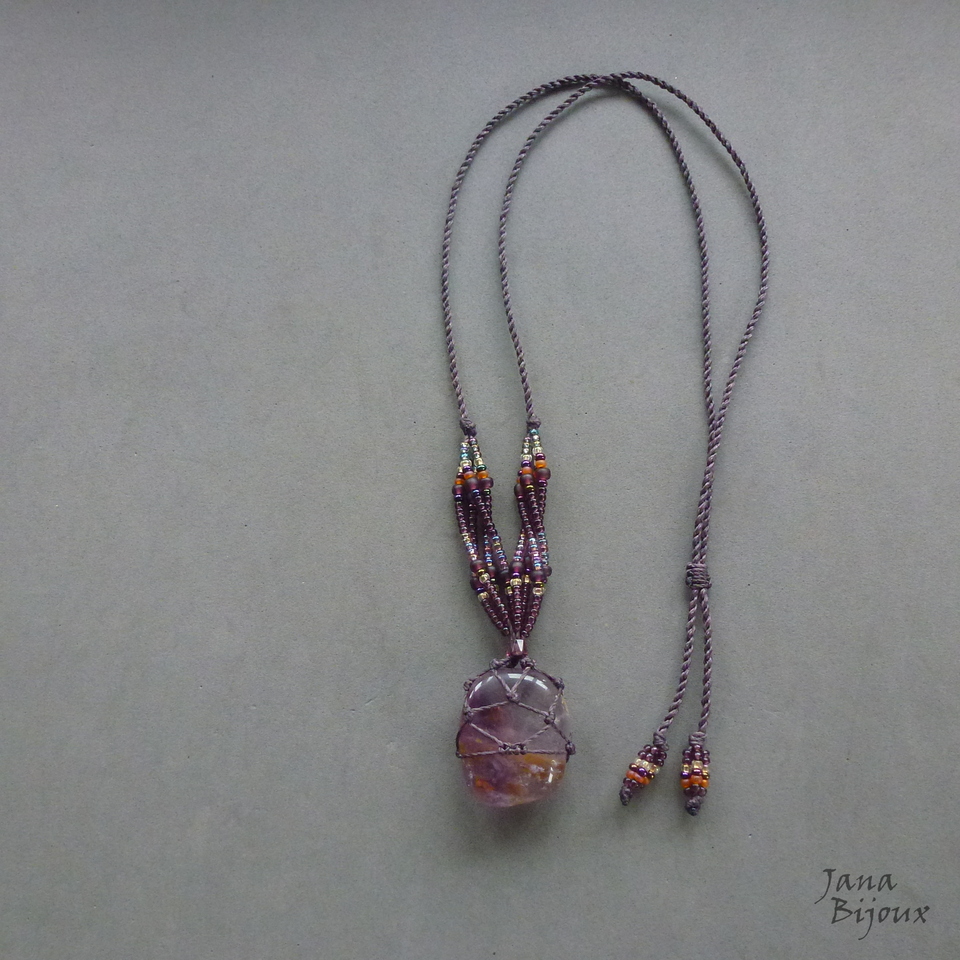 Ametista castroada, miçangas e comprimento ajustável.