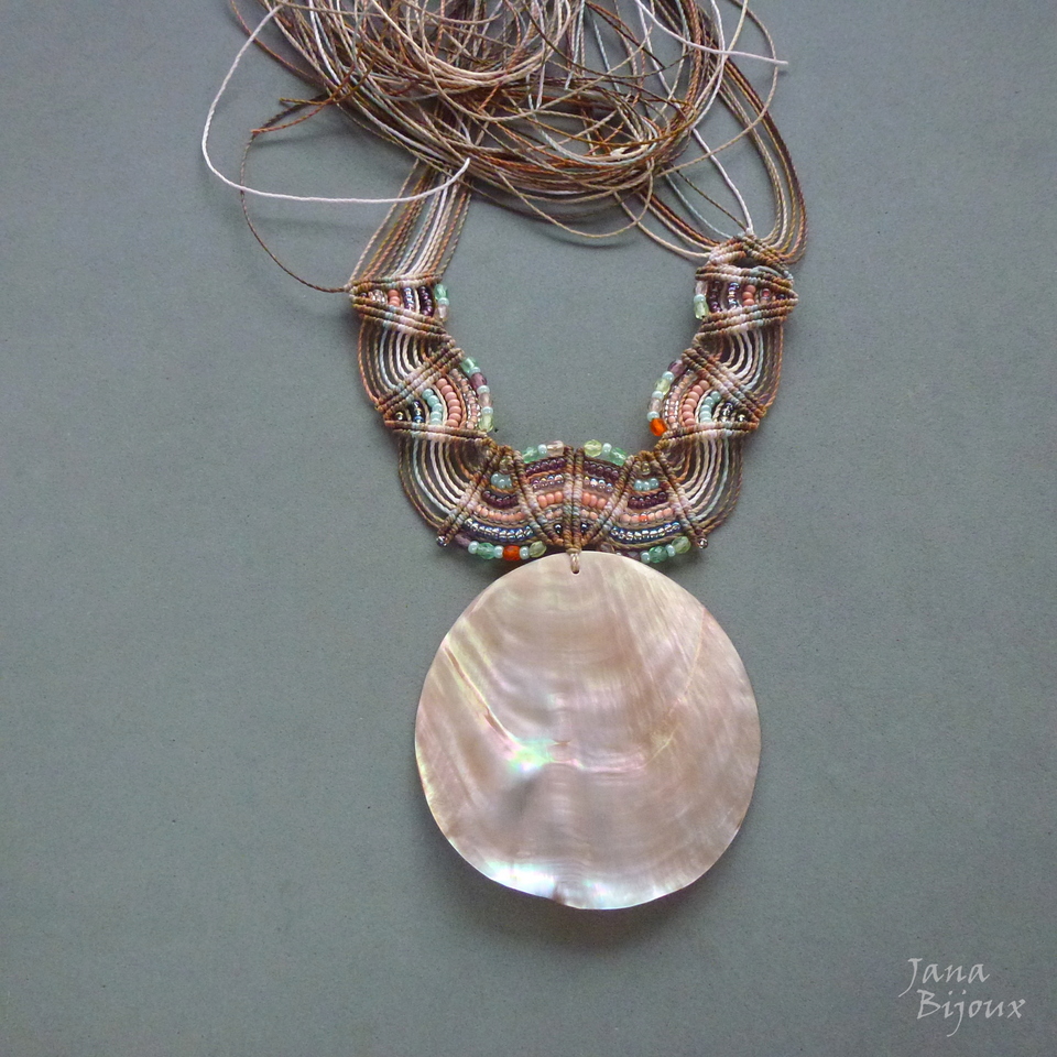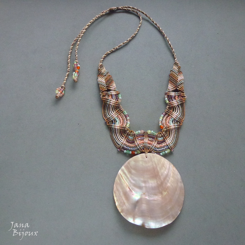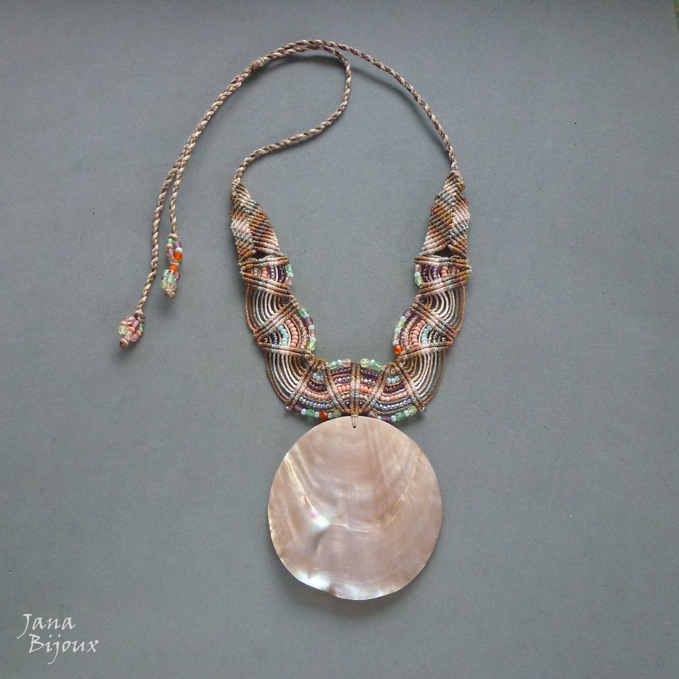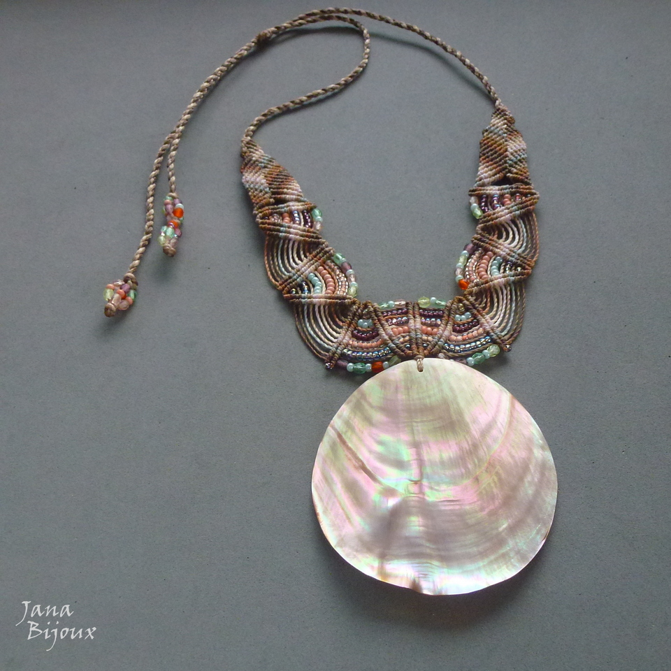 Maxicolar  com comprimento ajustável, concha grande natural, vintage de Indonésia, macramé, miçangas, cristais foscos de República Tcheca e sem nenhum metal.
