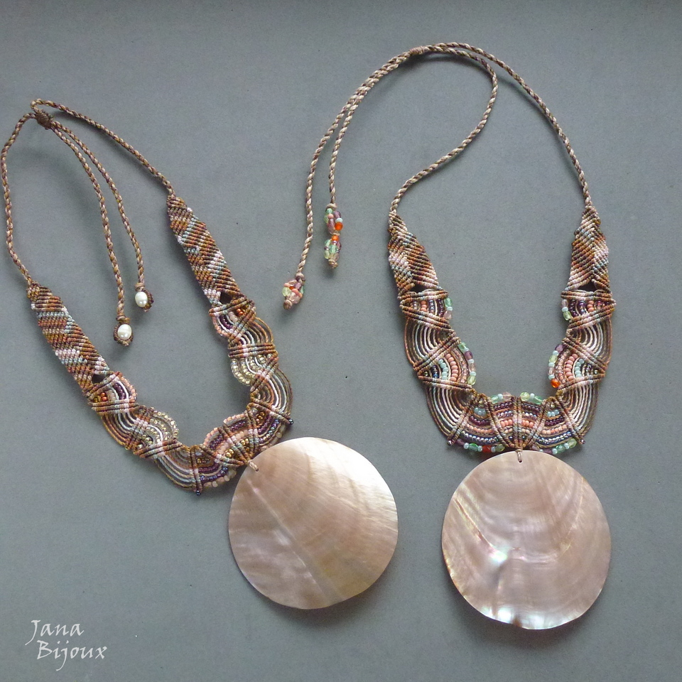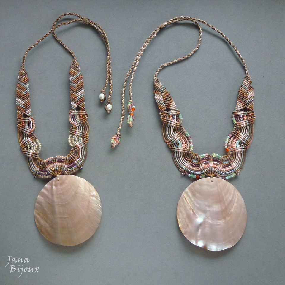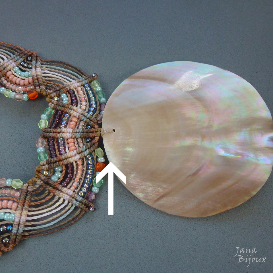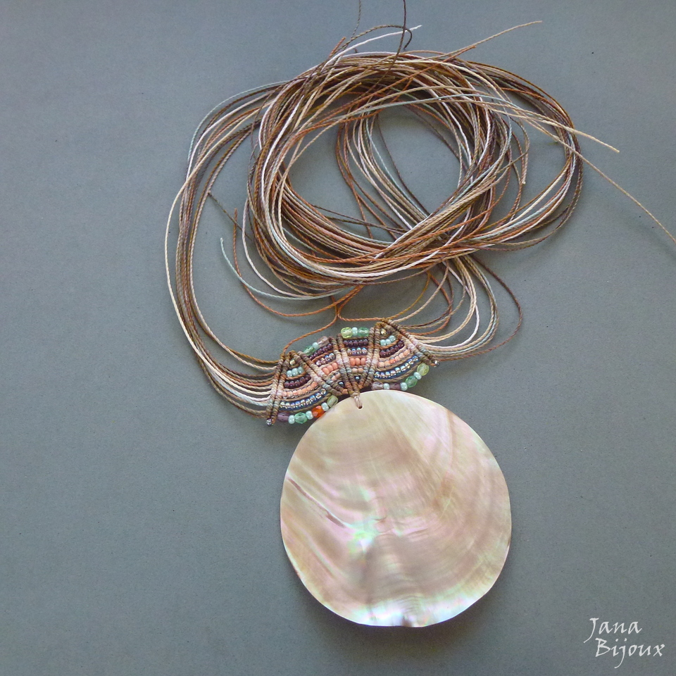 Maxicolar  com comprimento ajustável, concha grande natural, vintage de Indonésia, macramé, miçangas, cristais foscos de República Tcheca e sem nenhum metal.