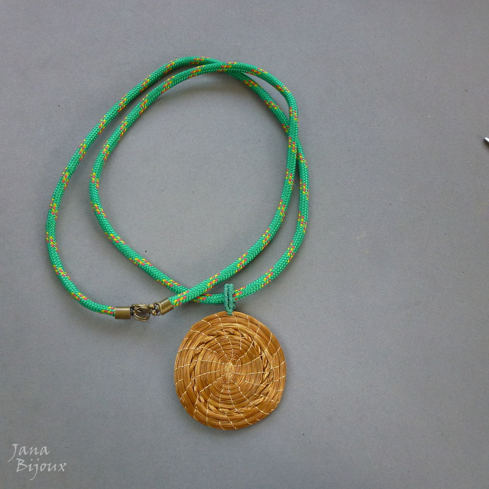 Colar contemporãneo, divertido, com cordão de escalada verde vibrante, macramé na alça e capim dourado, mede 5 cm com a alça 6,5 cm.