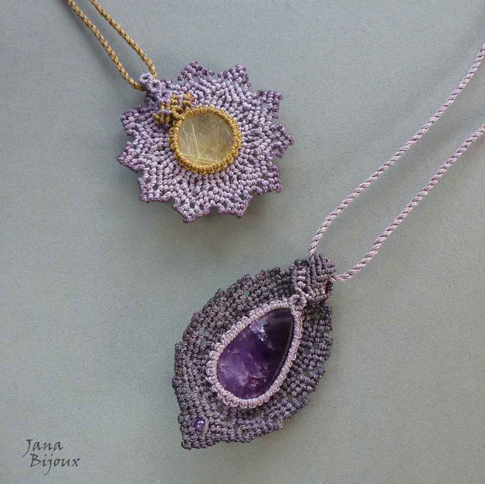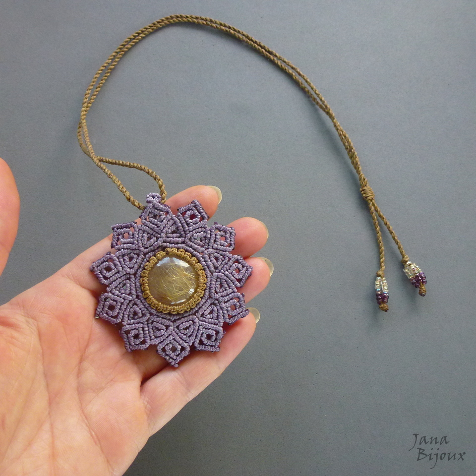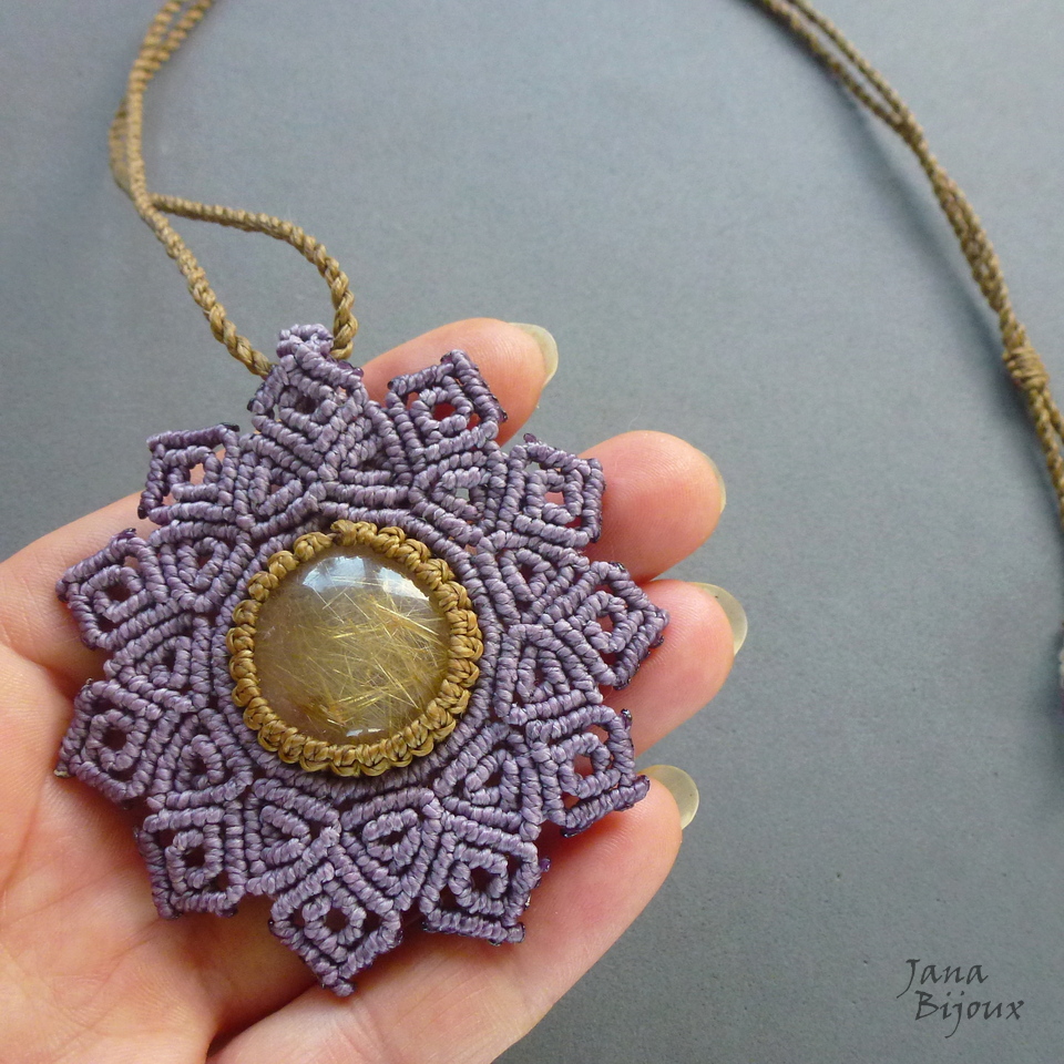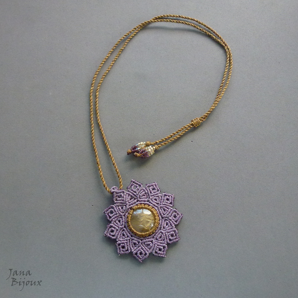 Quartzo rutilado (com lindos “fios dourados” ) em pingente de macramé em lindo tom de lilás acinzentado..