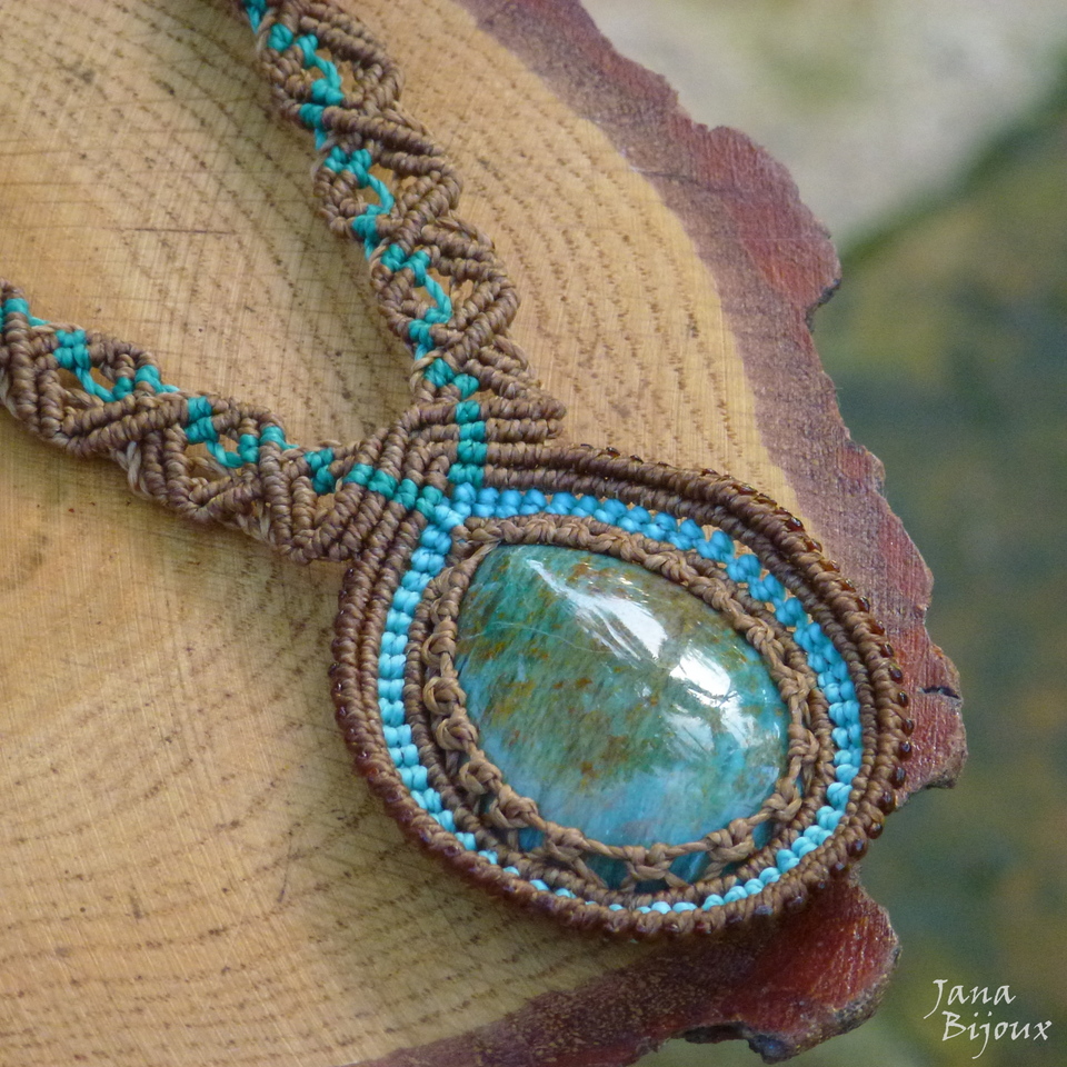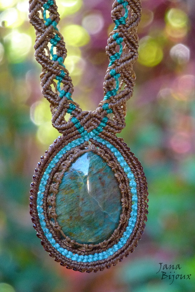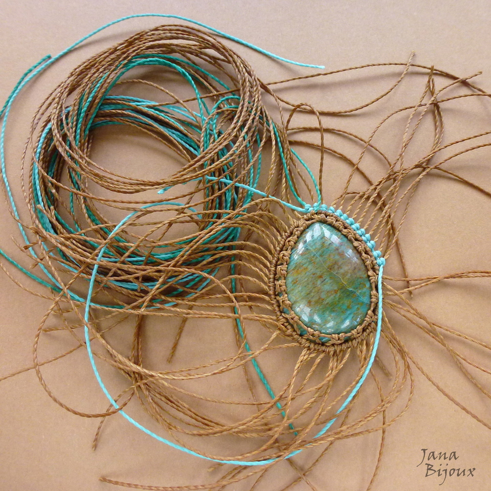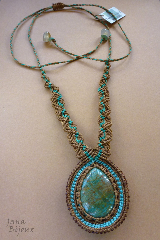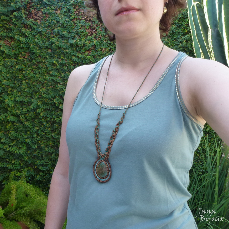 Colar com comprimento ajustável com gota de pedra verde (nome dele estou pesquisando) , macramé e sem nenhum metal. O caimento é perfeito, pode ser usado como curto ou comprido, abre até 94 cm.