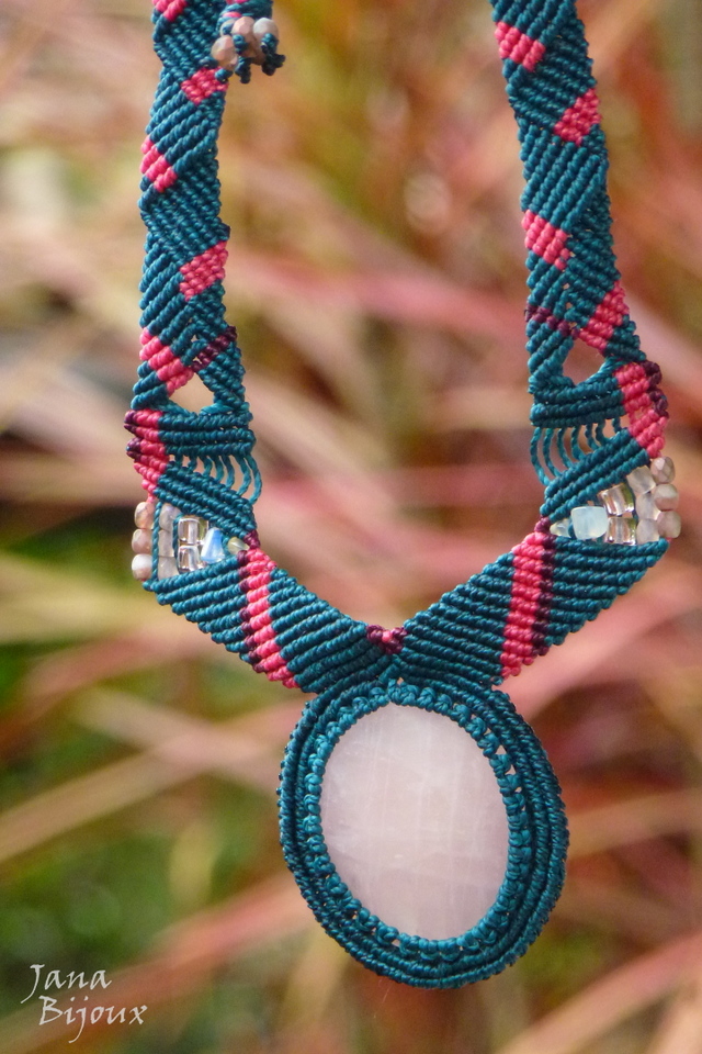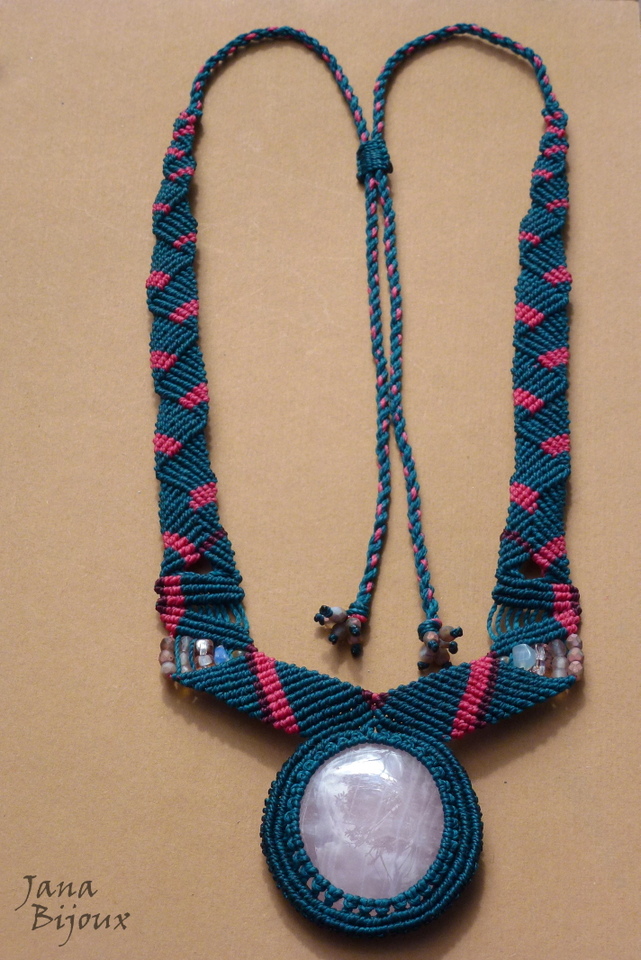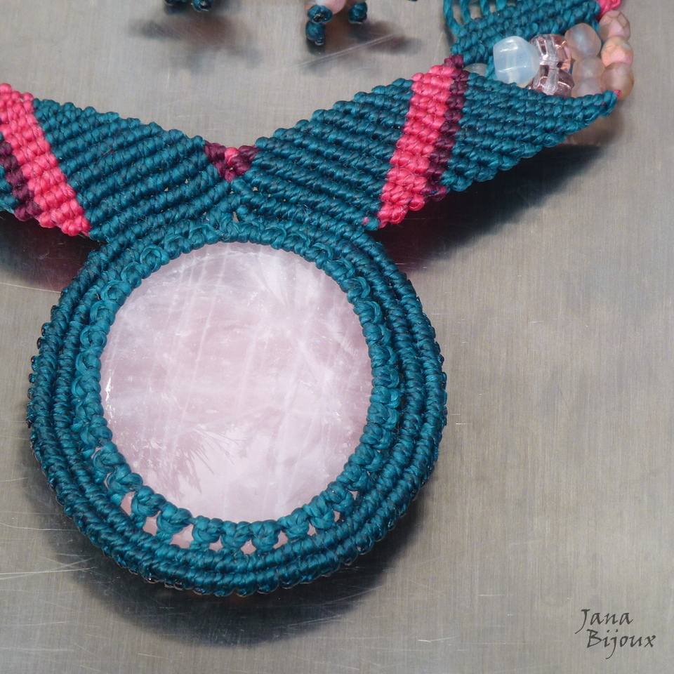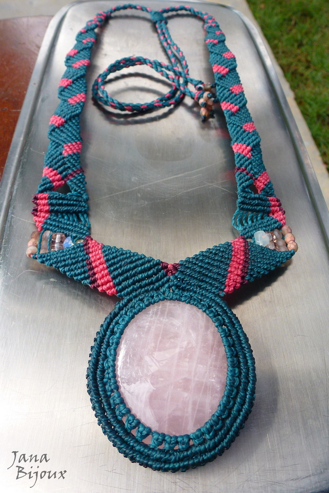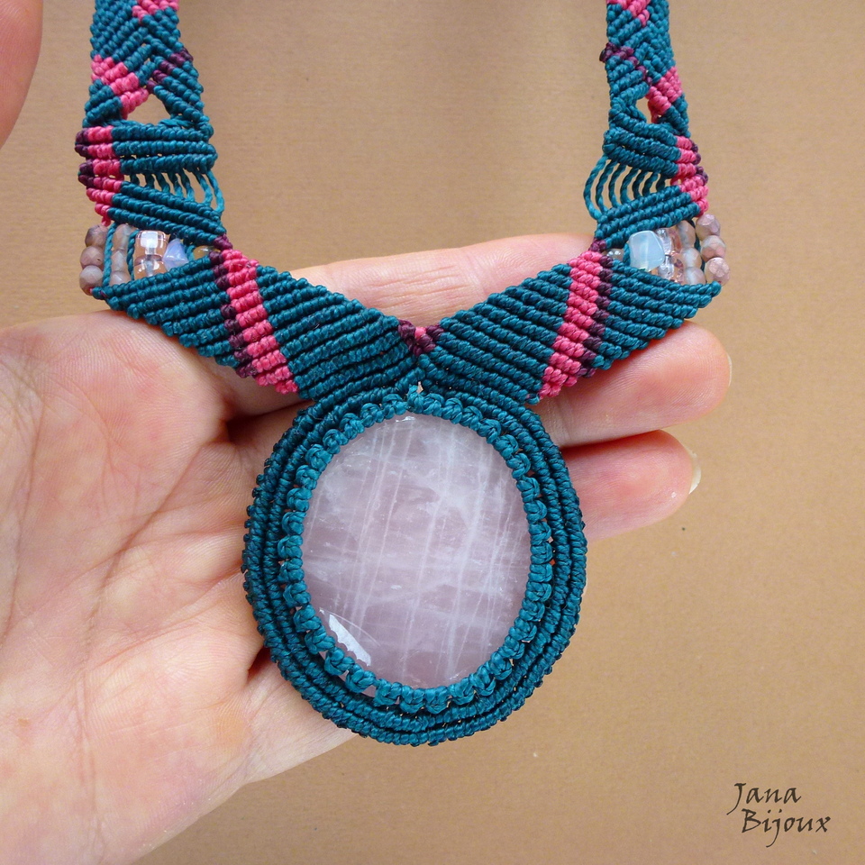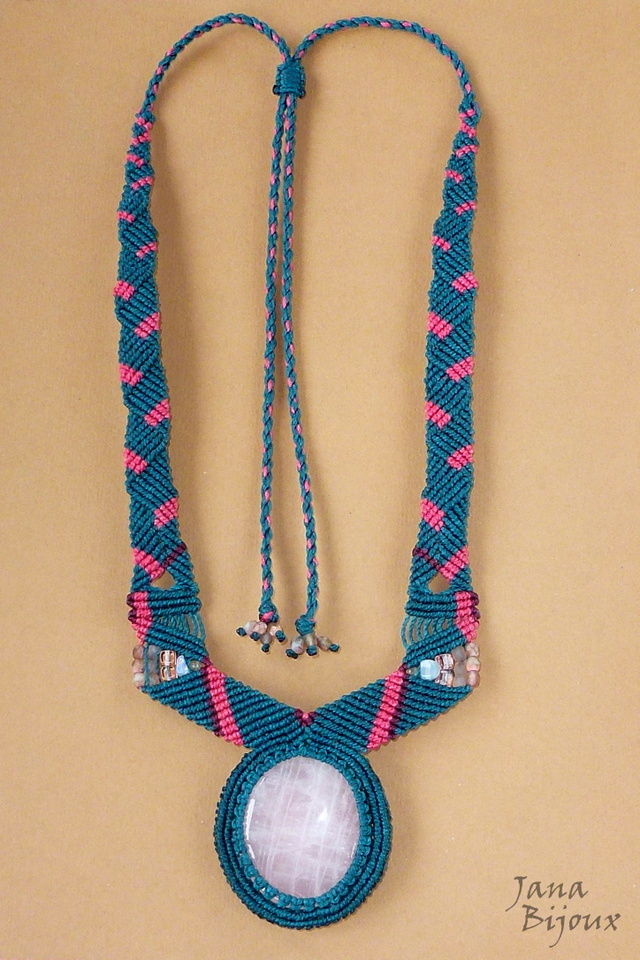Colar com comprimento regulável, macramé, quartzo rosa e sem nenhum metal.