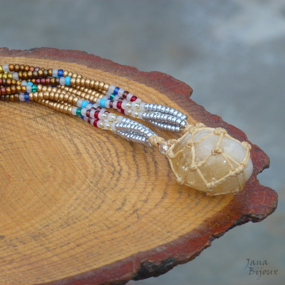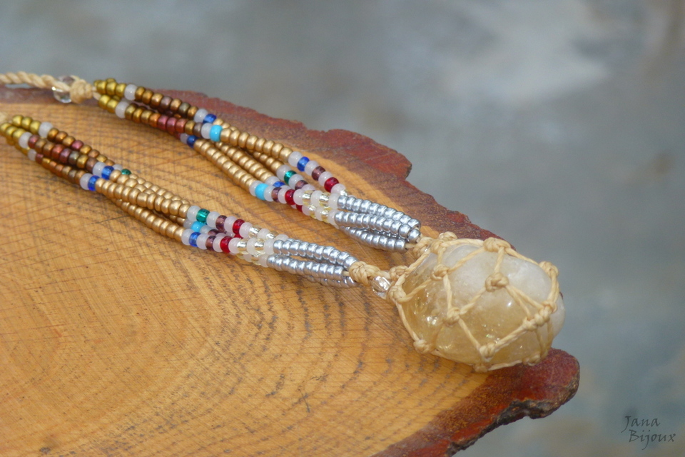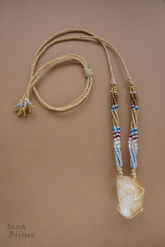 Colar com comprimento ajustável, delicado, com quartzo amarelo cintrino, macramé e miçangas.