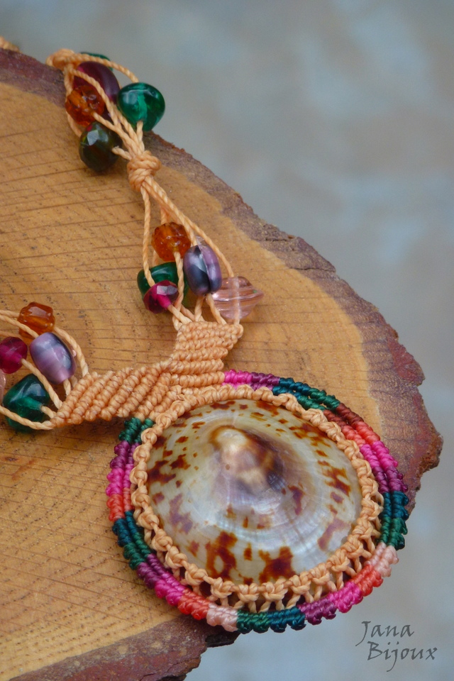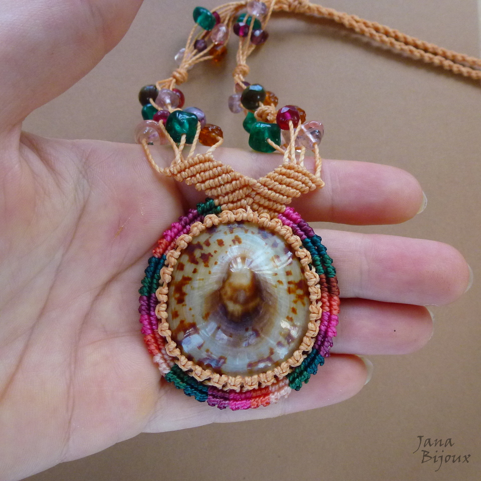 Colar alegre de macramé, sem metal com concha e vidro..