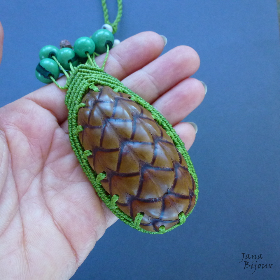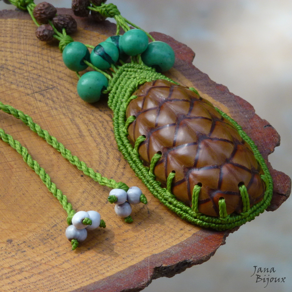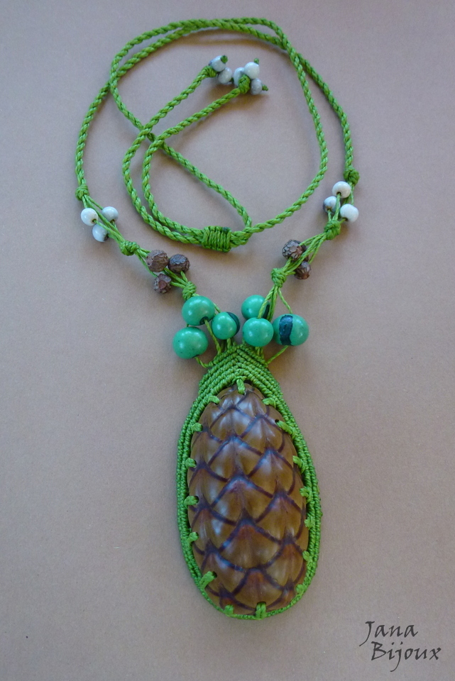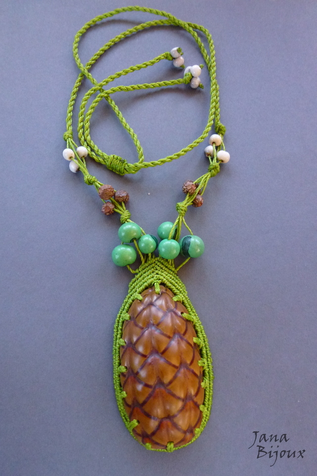 Hravý, extravagantní a zajímavý náhrdleník s exotickými plody s upravitelnou délkou. Max rozměr dokola náhrdleníku je 92 cm (bez skořápky). Na každým konci náhrdleníku má 3 malá semínka na ozdobu. Zelená semínka nad šiškou jsou barvená, ostatní jsou všechny přírodní.