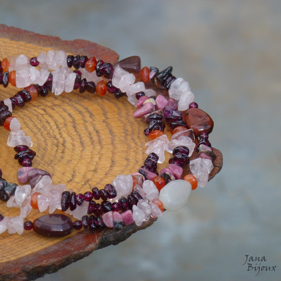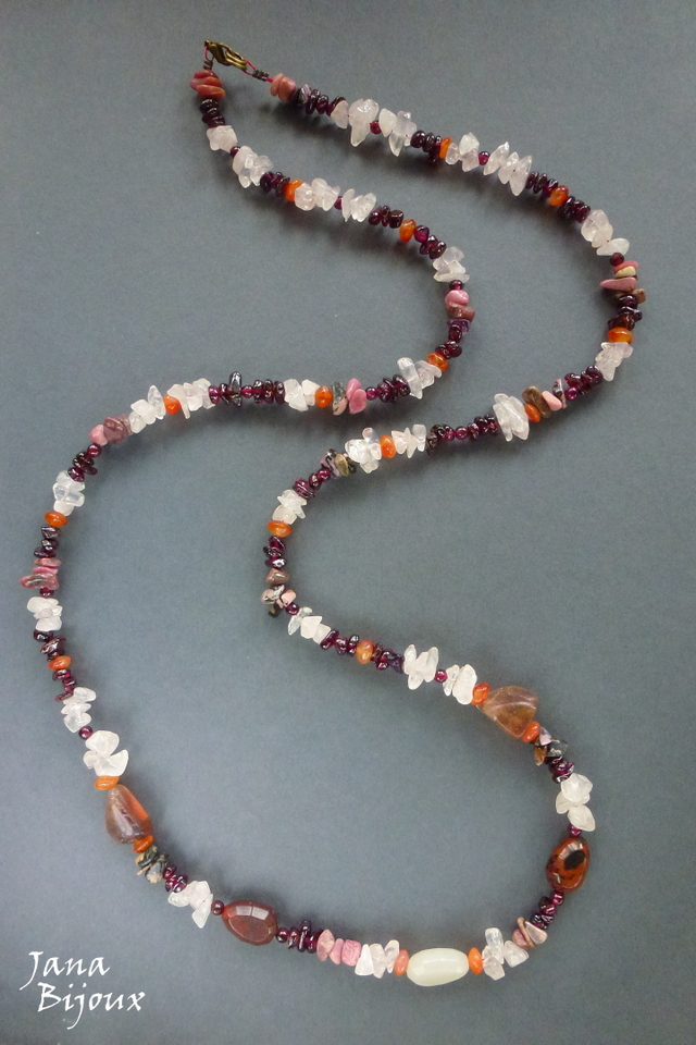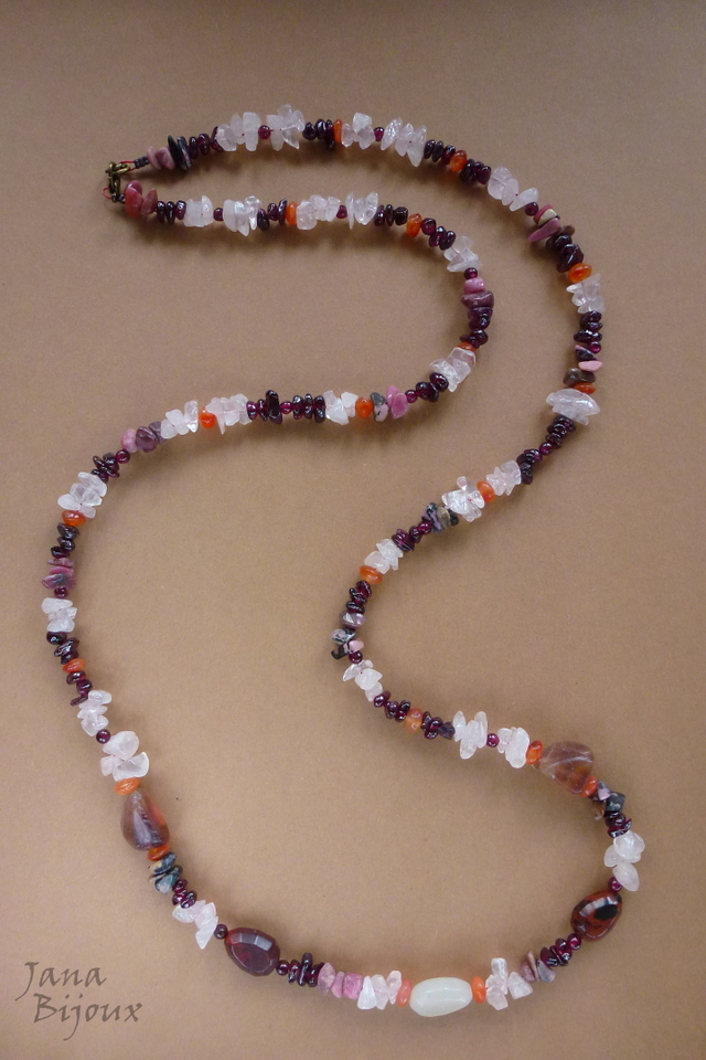Colar comprido de pedras naturais… quartzo rosa, granada, carneola, rodonita, fluorita arco iris, jaspe,  acabamento em ouro velho R$ 38,00