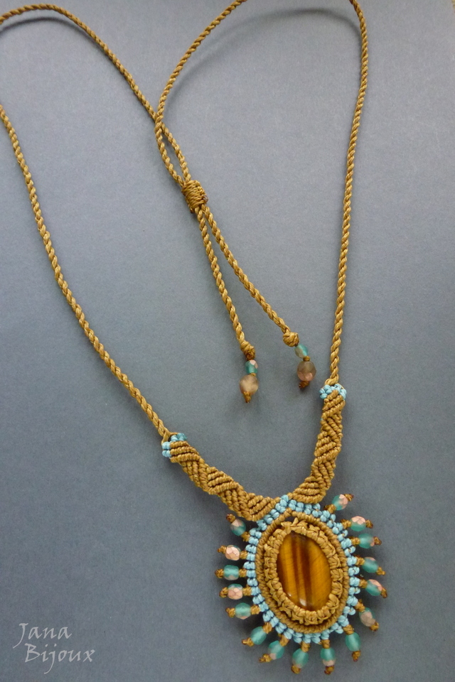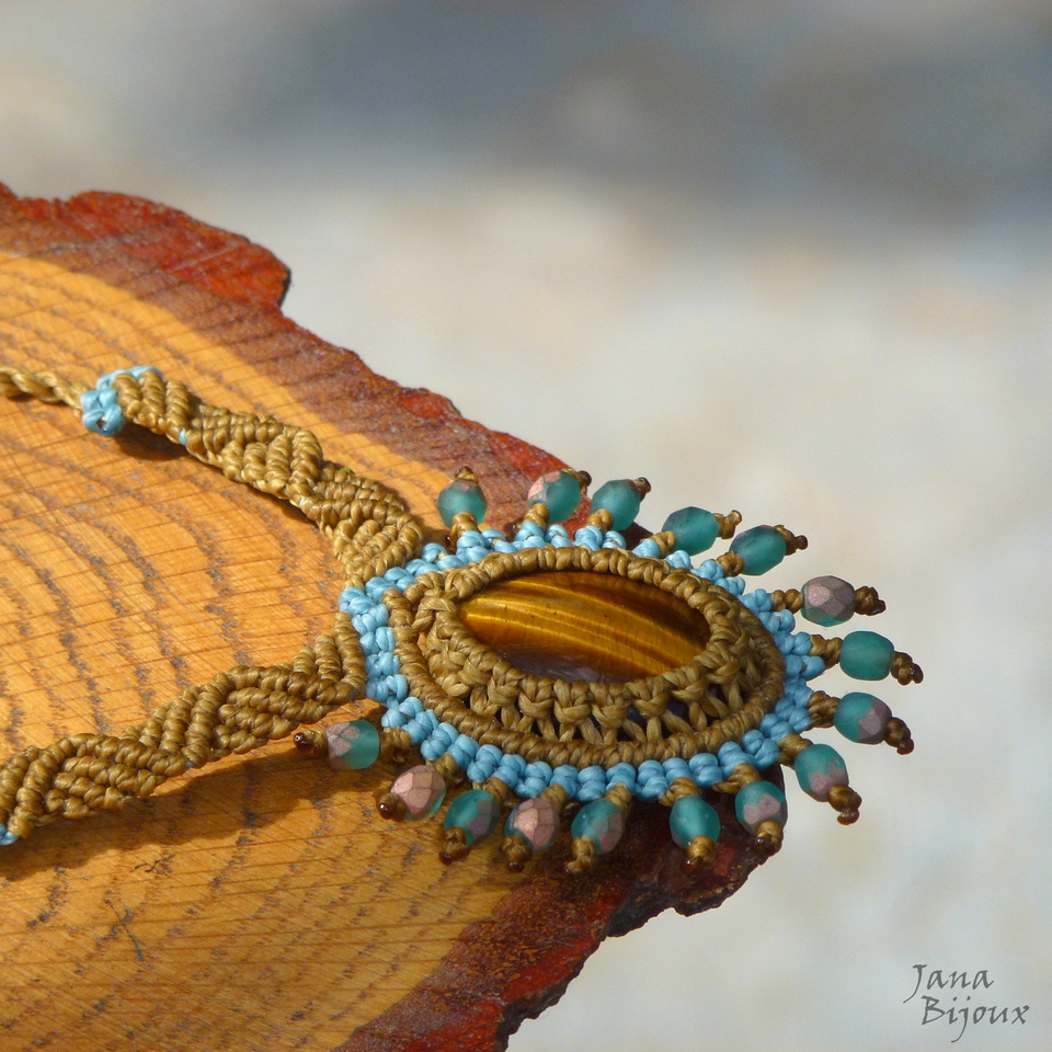 Colar delicado com pedra natural de olho-de-tirgre, cristais e macramé.