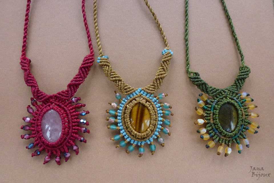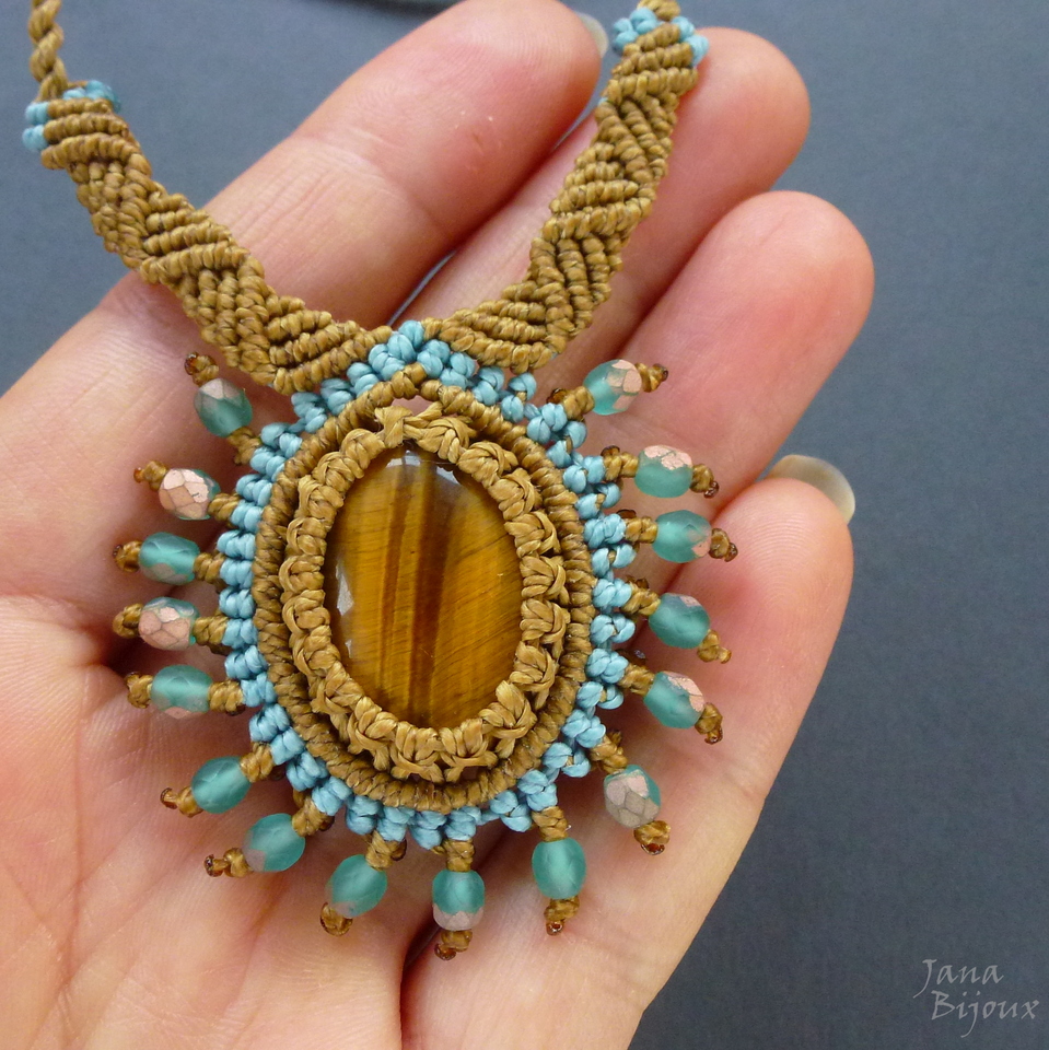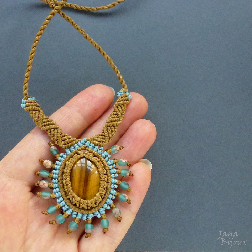 Caimento e acabamento perfeito, pode ser usado como curto, médio ou comprido, todo feito de macramé, abre até 96 cm,nas pontas cristais turquesa foscos, os mesmos que estão em volta da pedra central.