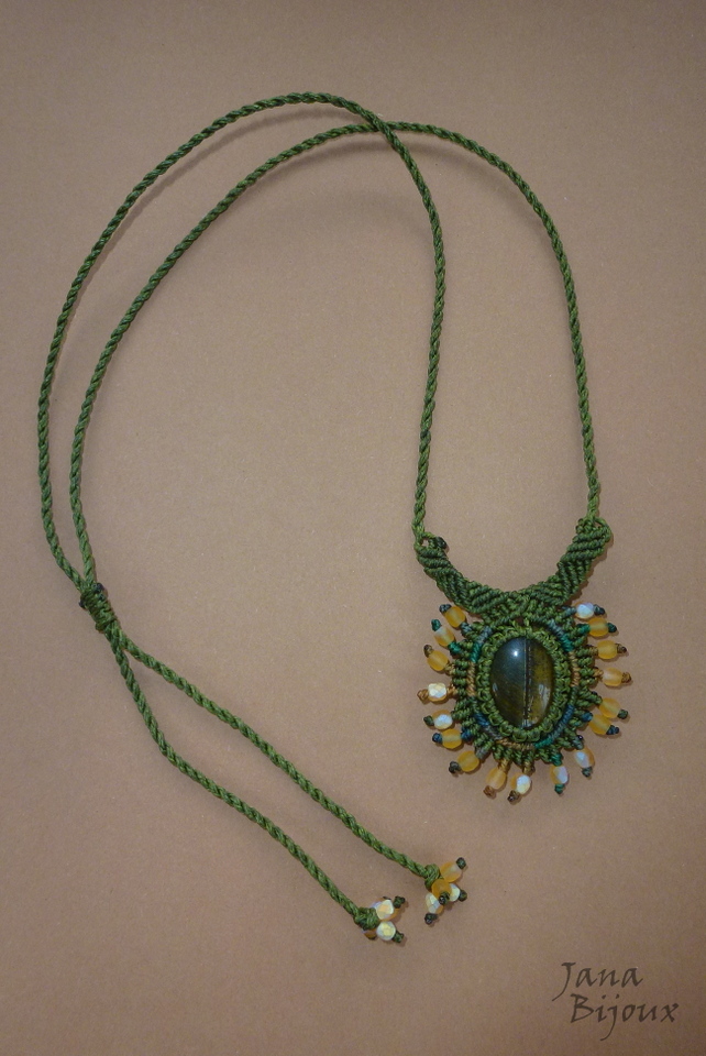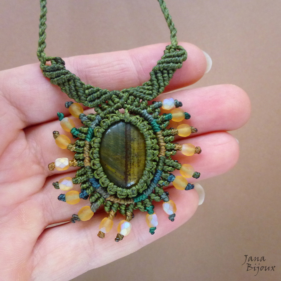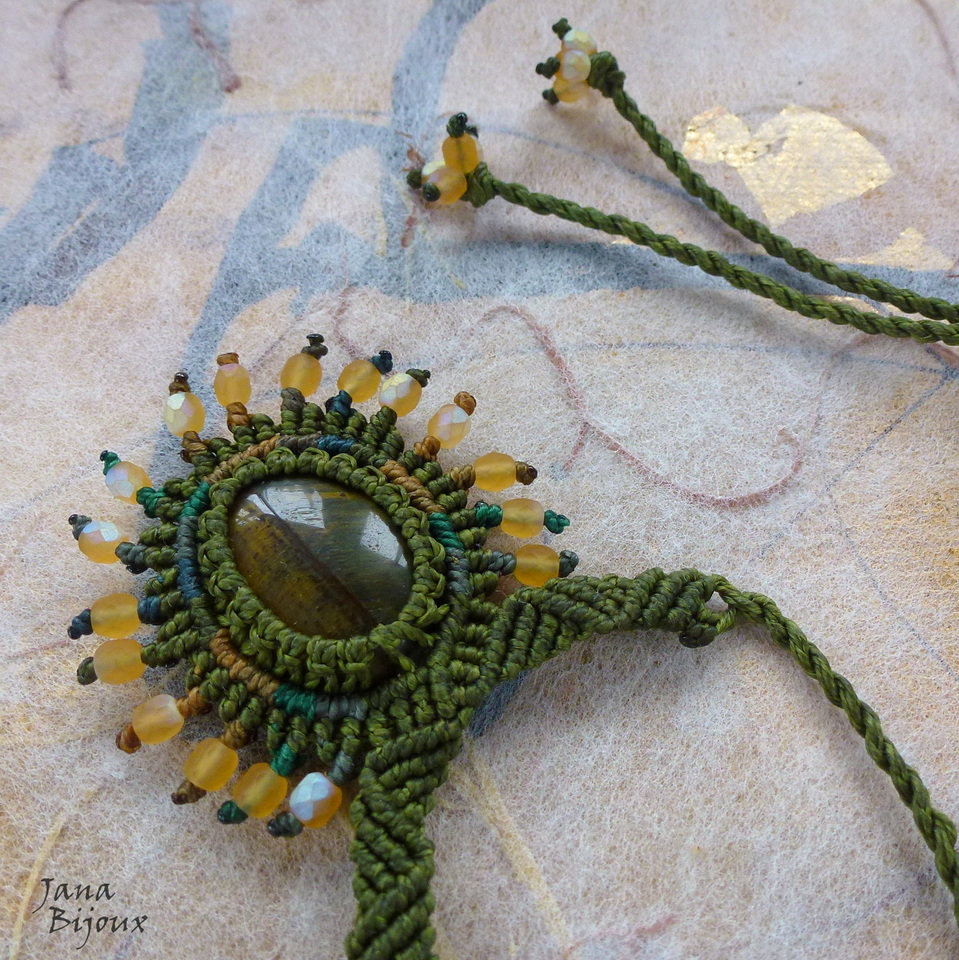 “Sluníčkový” přívěšek měří 4,5 cm samotný kabošon má 2 cm x 1,5 cm. Kámen drží za pomocí uzlů, není lepen ani vrtán. Aby náhrdelník nepůsobil příliš usedle, namíchala jsem kolem centrálního kamene i jiné tóny zelených nití a zlatavých tónů, které se hodí do odlesků kamene.