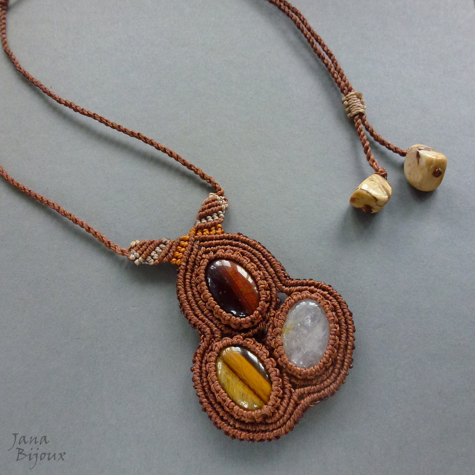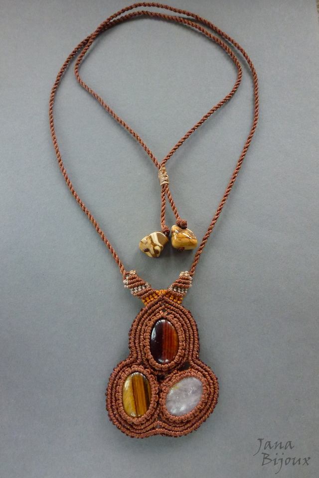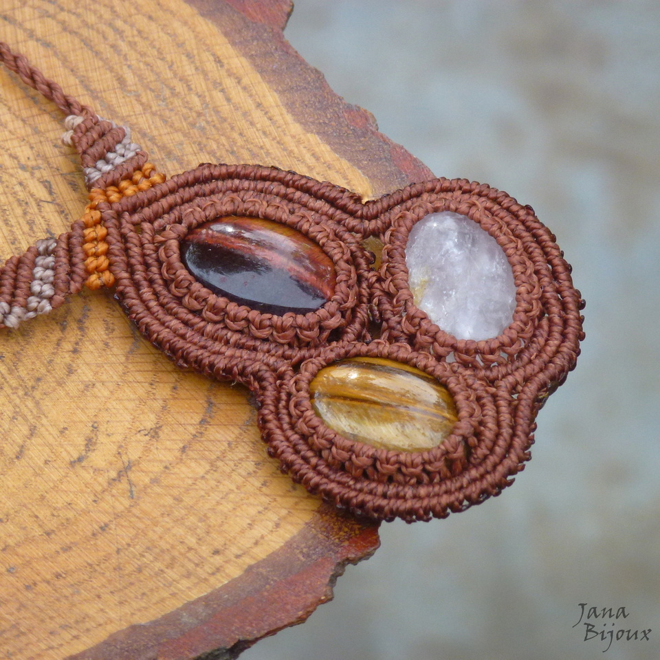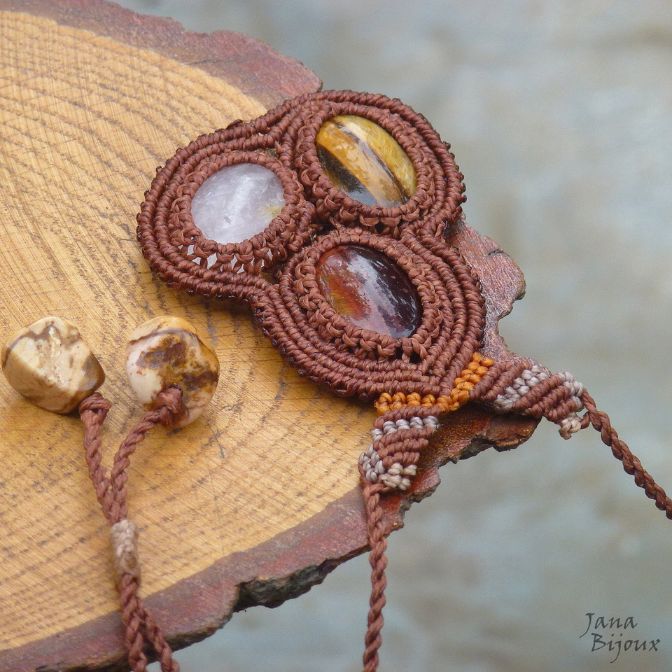 Colar com comprimento ajustável e 3 tipos de pedras naturais ( Olho-de-boi, olho-de-tigre e quartzo, tem junto 7 cm) segurando junto só com macramé e 4. tipo de pedra no acabamento.