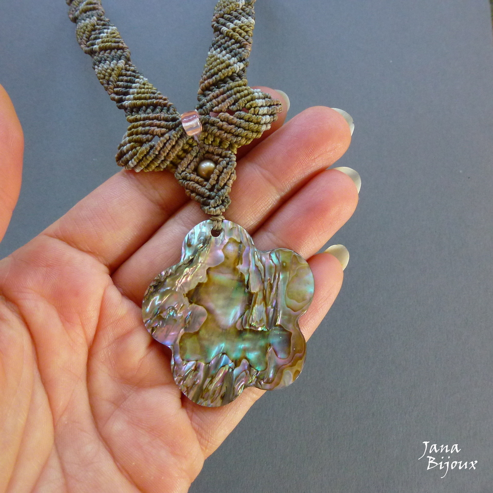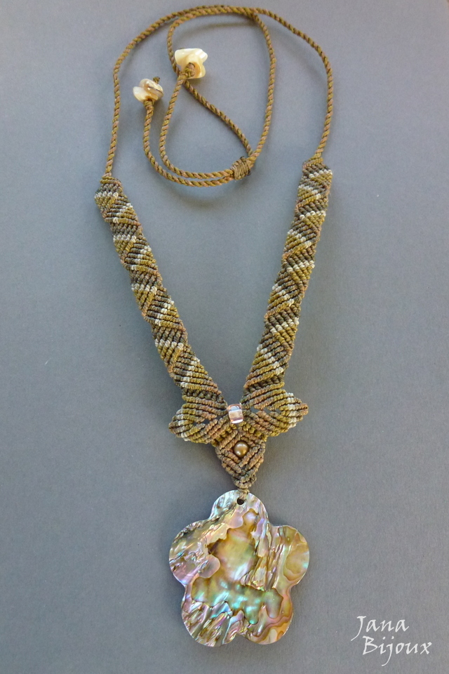 Colar com flor de abalone e macramé.