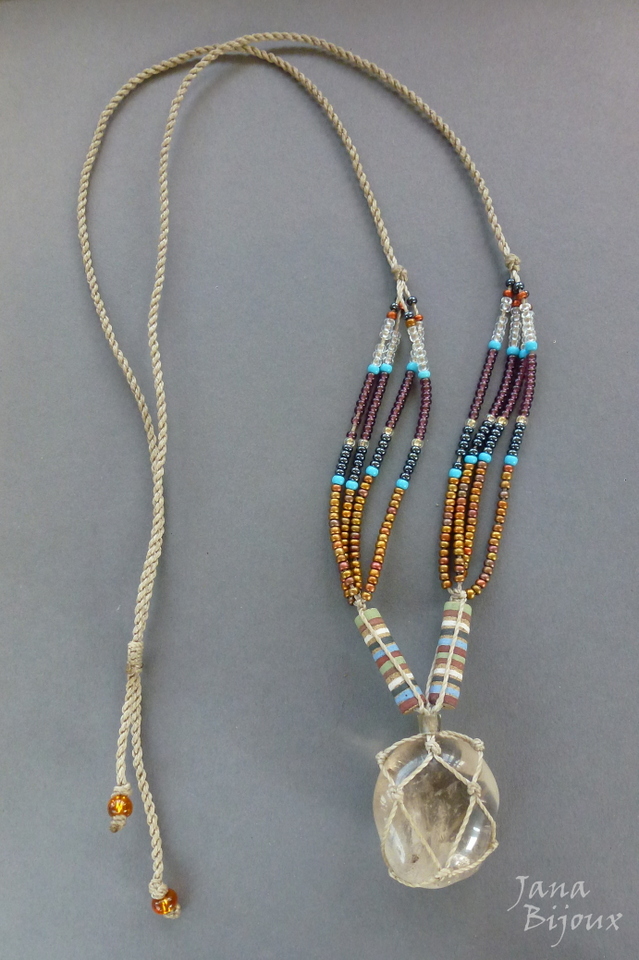 Colar comprido com miçangas importadas, 2 peças de cerâmicas feitas e pintadas a mão, pedra rústica e comprimento ajustável.