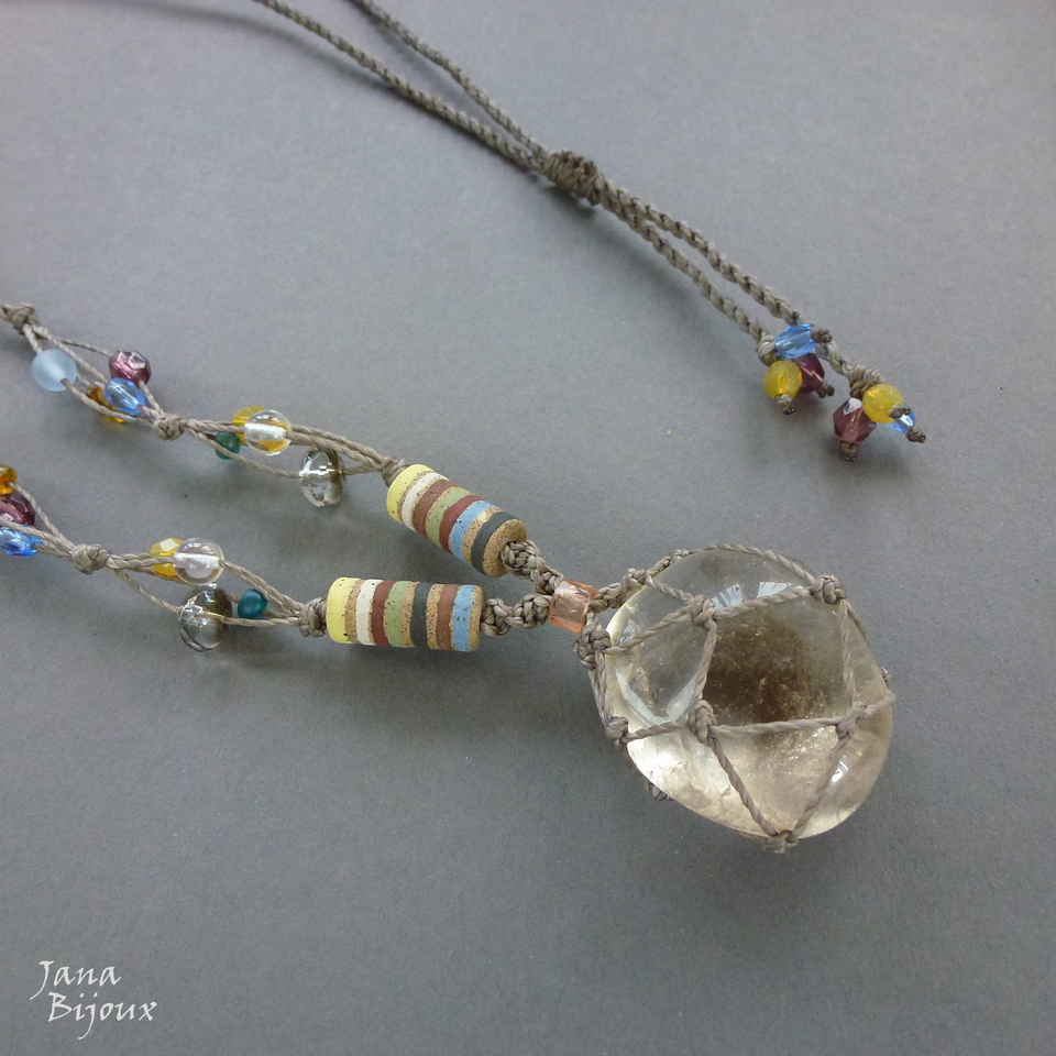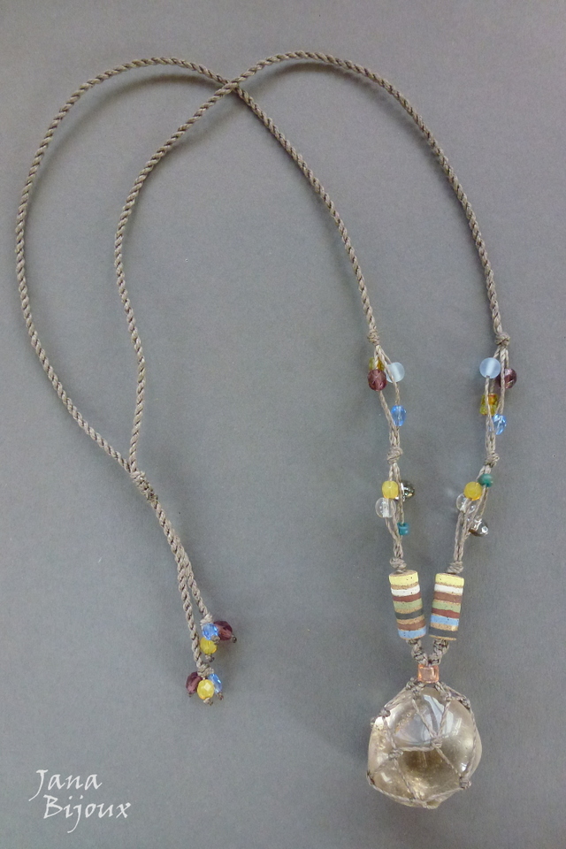 Colar comprido com vidros importados, pedra rústica, cerâmica pintada a mão pela cerâmista Janete Dallabona e comprimento ajustável.
