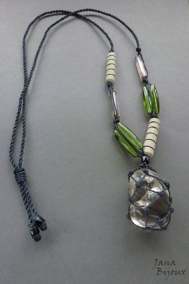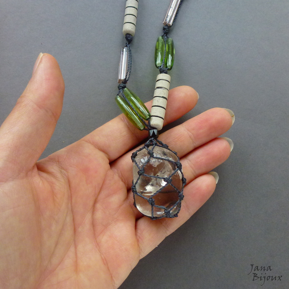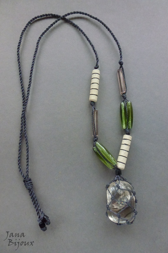 Colar assimétrico, comprido com vidros e cristais importados, pedra rústica, cerâmica feita a mão pela cerâmista Janete Dallabona e comprimento ajustável.