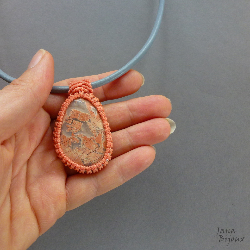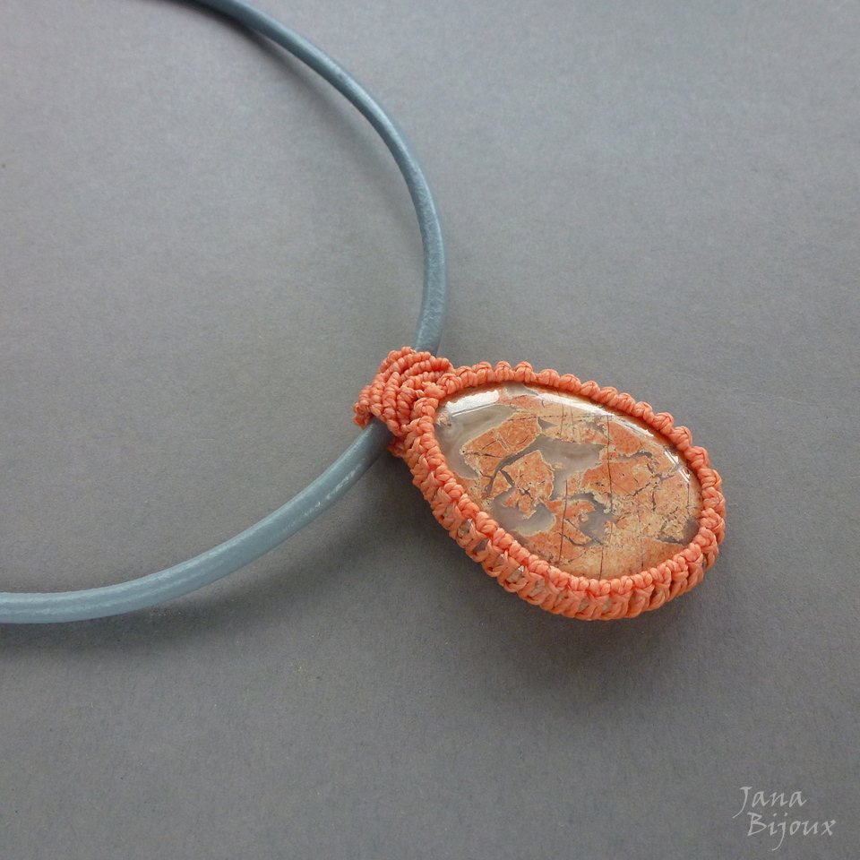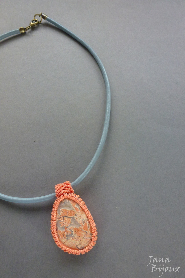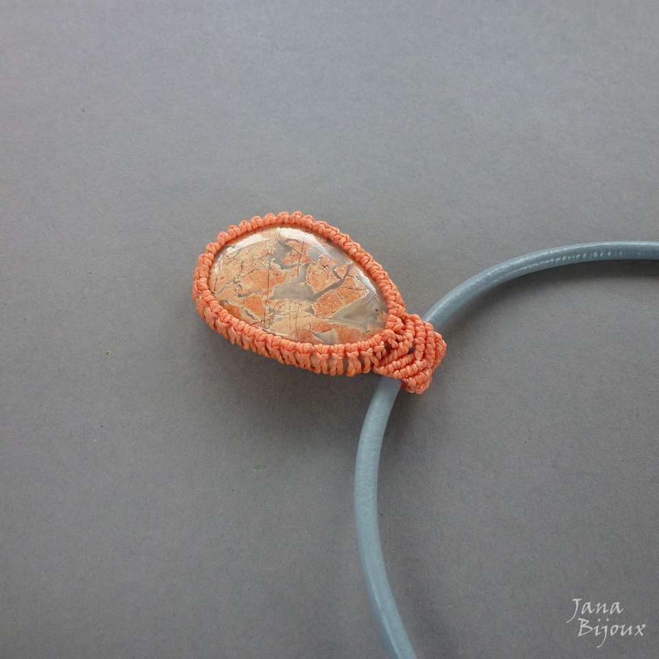 Colar curto 52 cm, com linda pedra de jaspe claro, em macramé, segura só com nós, sem cola e sem furo, mede 4,5 cm por 3,2 cm e tem cor salmão. Couro luxuoso, importado. A pedra pode ser usado de dois lados. Acabamento em ouro velho, fecho tamaho maior (1,5 cm) para ser proporcional, mais luxuoso e manuseio mais fácil. R$ 45,00