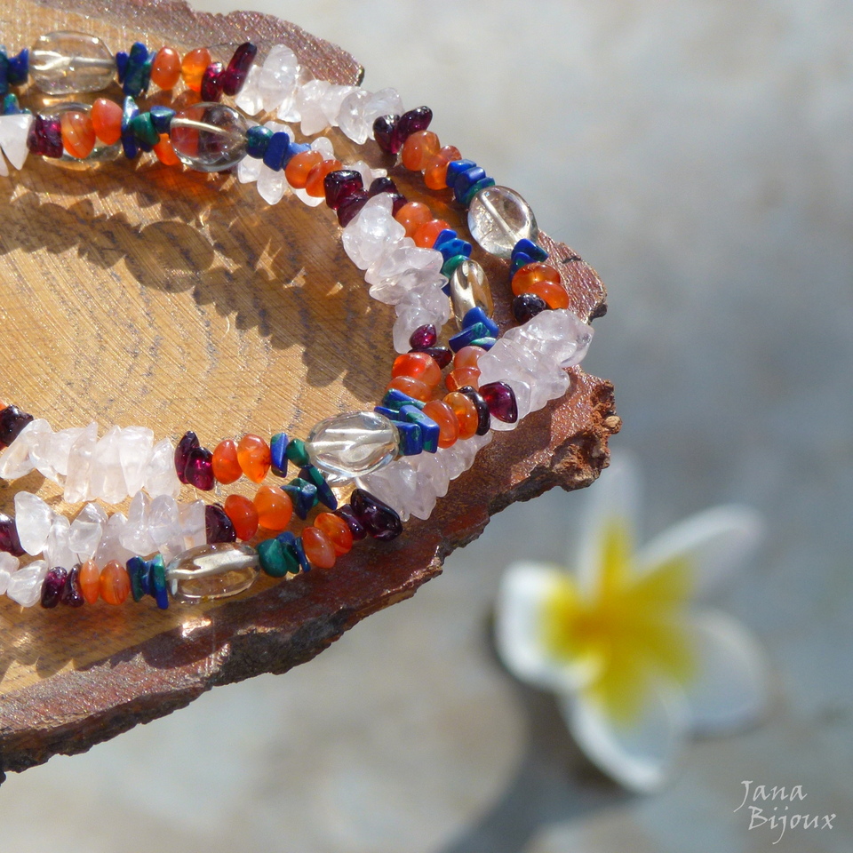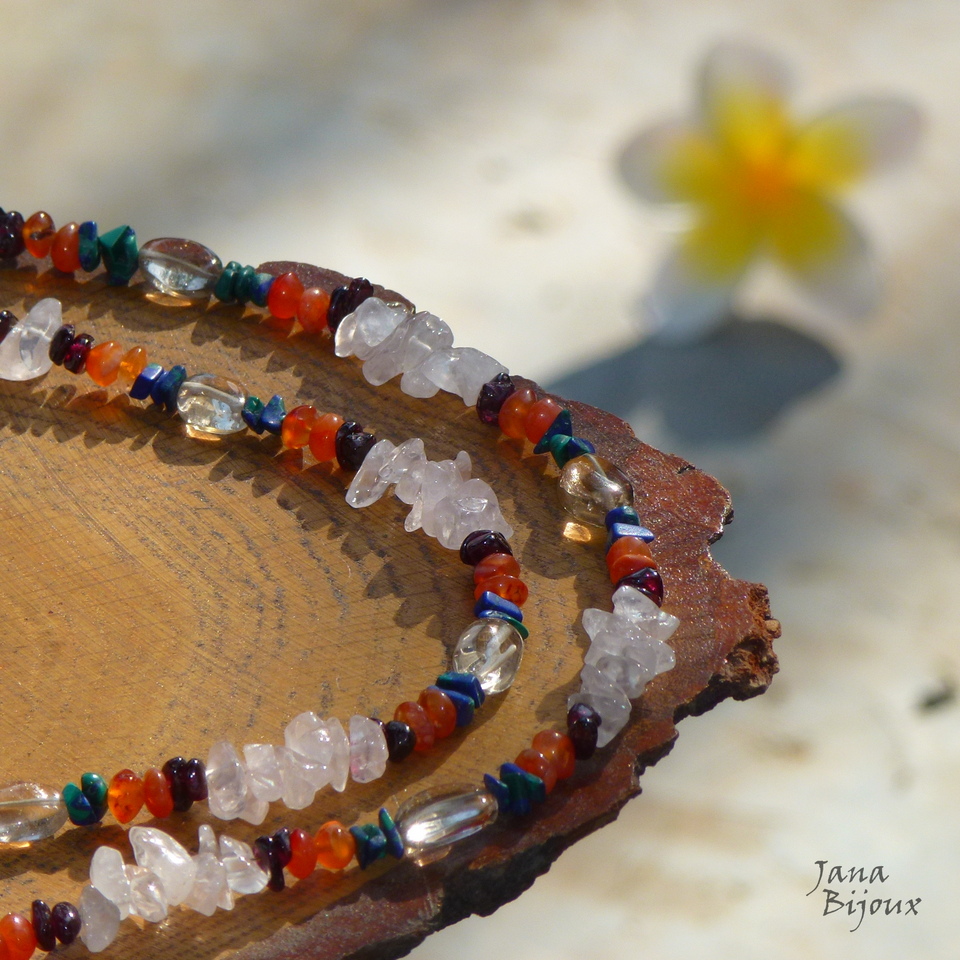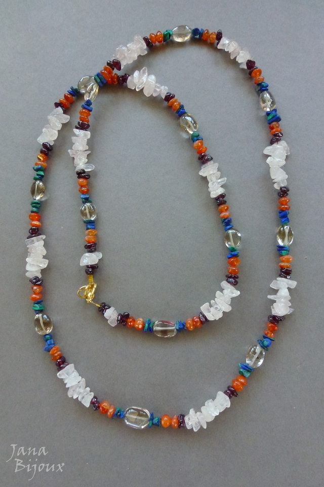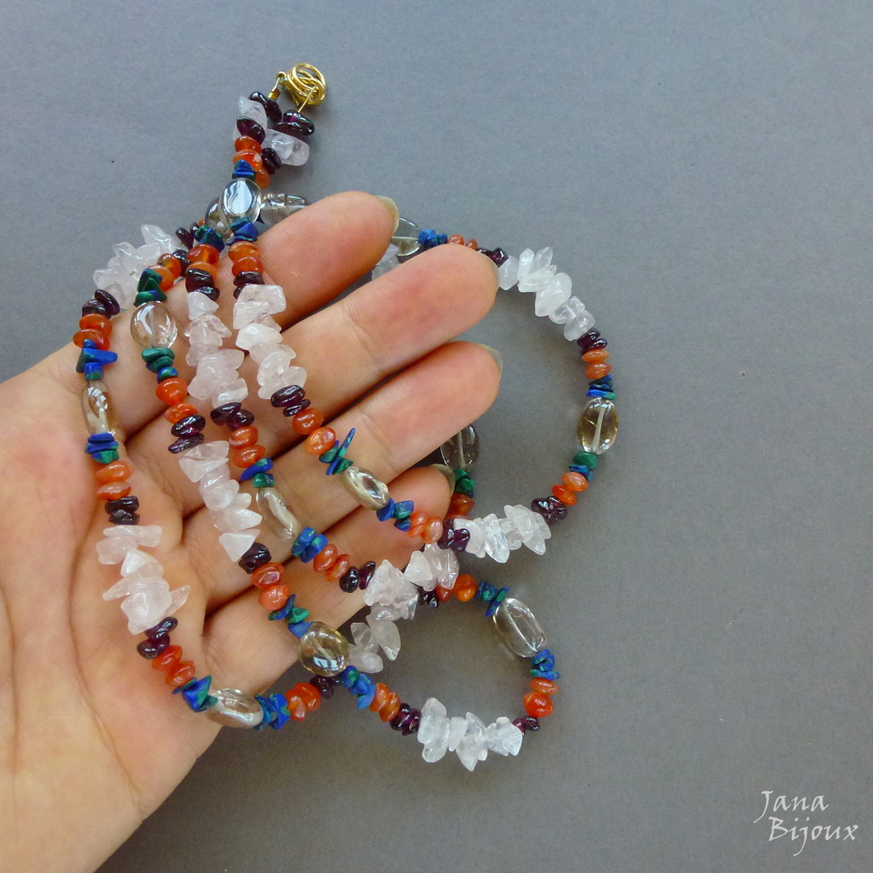 Colar comprido 87 cm de pedras naturais de diversos tipos.. cascalho e contas arredondadas.. de quartzo rosa, granada, azurita malaquita, quartzo fumê e carneola. Acabamento dourado R$ 39,90