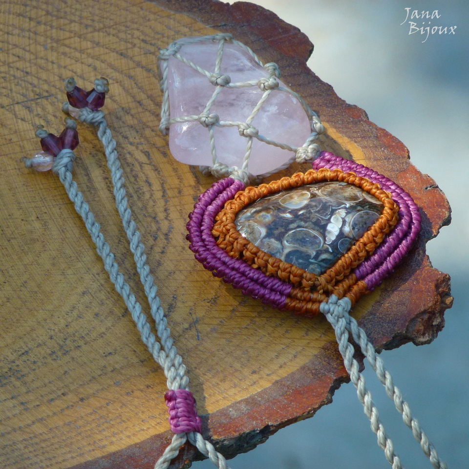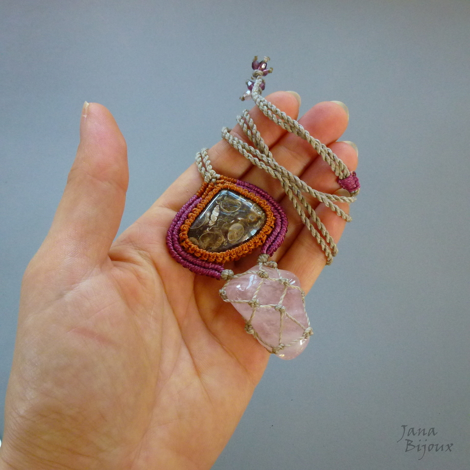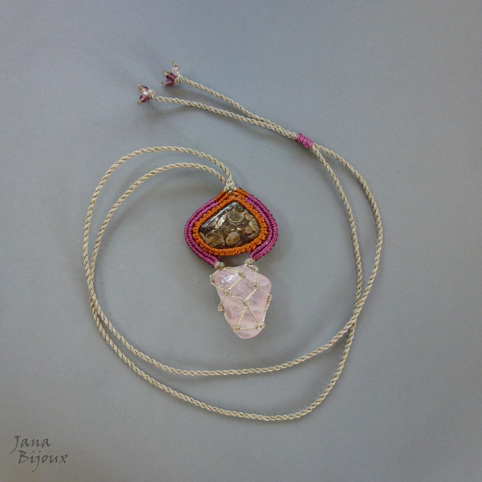 Colar de macramé com turritella agate (nome em inglês) = fóssil de Estados Unidos com pequenas conchas e pedra de quartzo rosa.