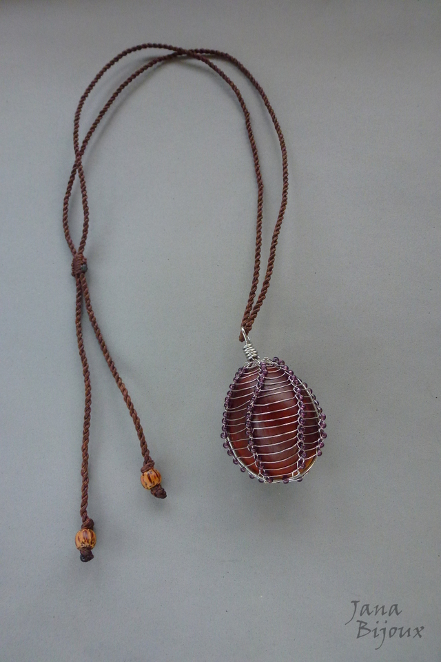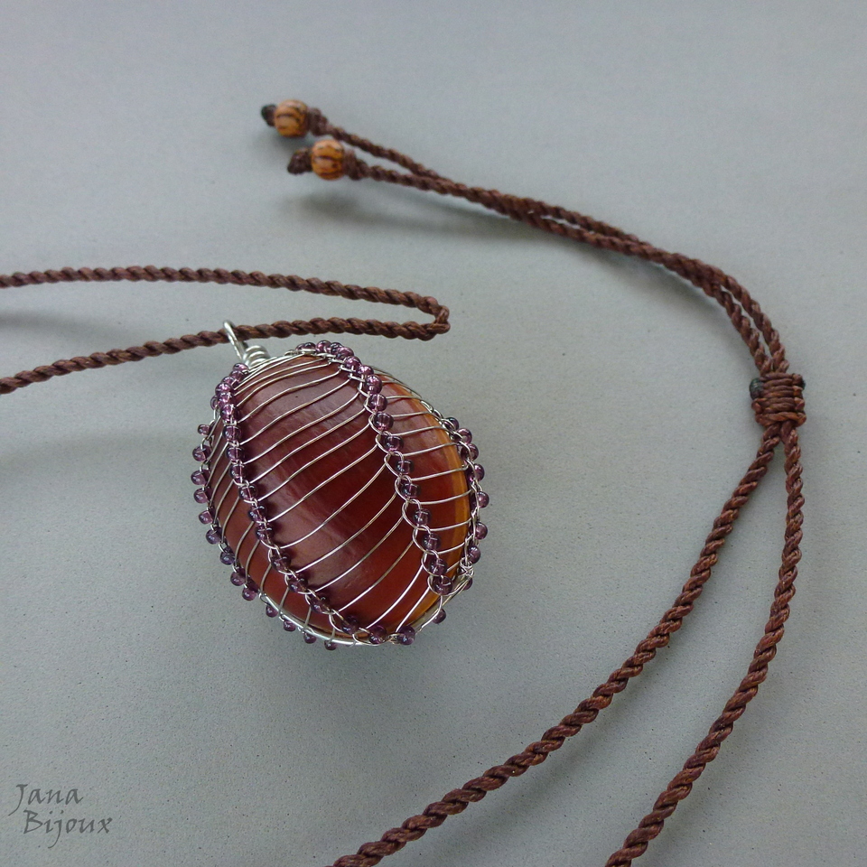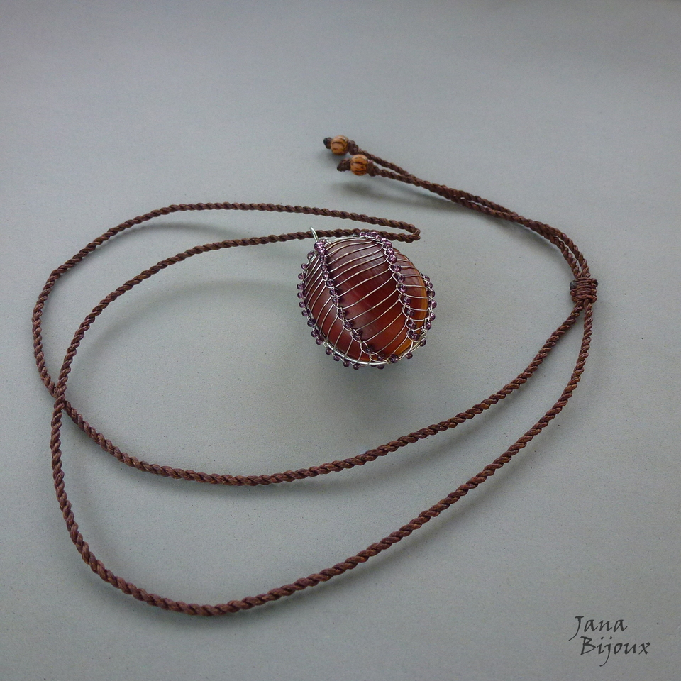 Olho-de-boi sem furo, envolvido em inox importado (100% antialérgico), forjado, trama de inox e miçangas discretas e fio marrom com comprimento ajustável.