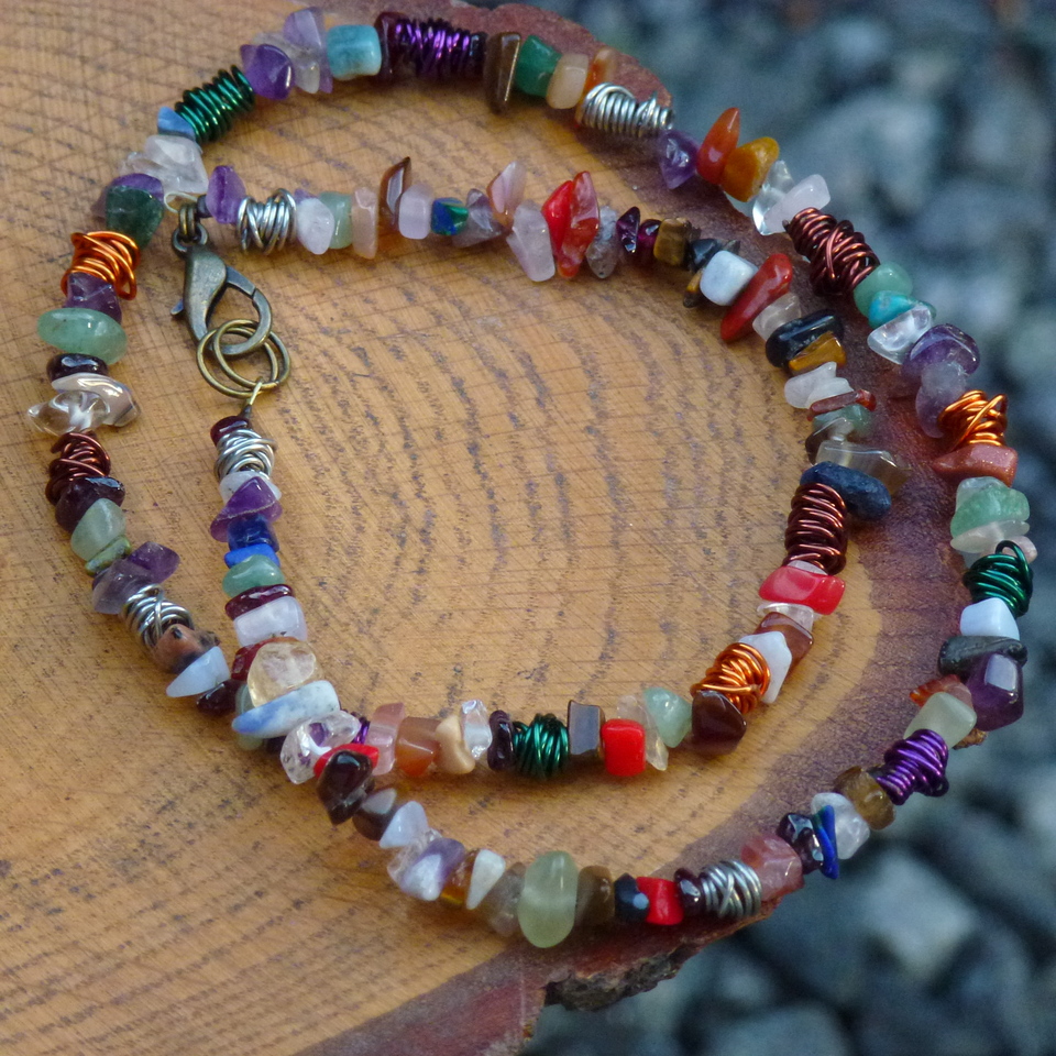 p532 26/05/2018VENDIDOS ( Prodáno)Jana Bijoux Colar curto 50 cm de pedras naturais, cascalho e peças feitas a mão de arames coloridos, importados. Acabamento ouro velho, fecho tamaho maior (1,5 cm) para ser mais proporcional, luxuoso e manuseio mais fácil. R$ 35,00